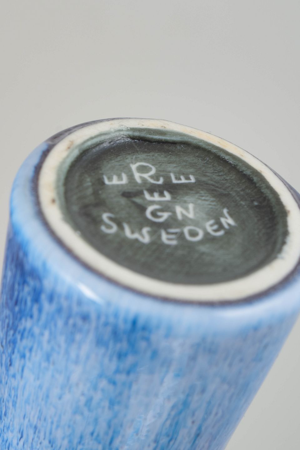 Slank vase i glaseret stentøj med lang, smal hals og let konisk krop. Overfladen er dækket af en levende blå glasur med fine lodrette spil og mørkere accent ved mundingen. Udført i første sortering og et fint eksempel på Gunnar Nylunds arbejde i mindre skala.