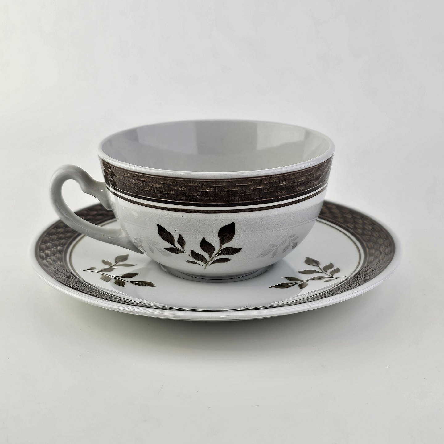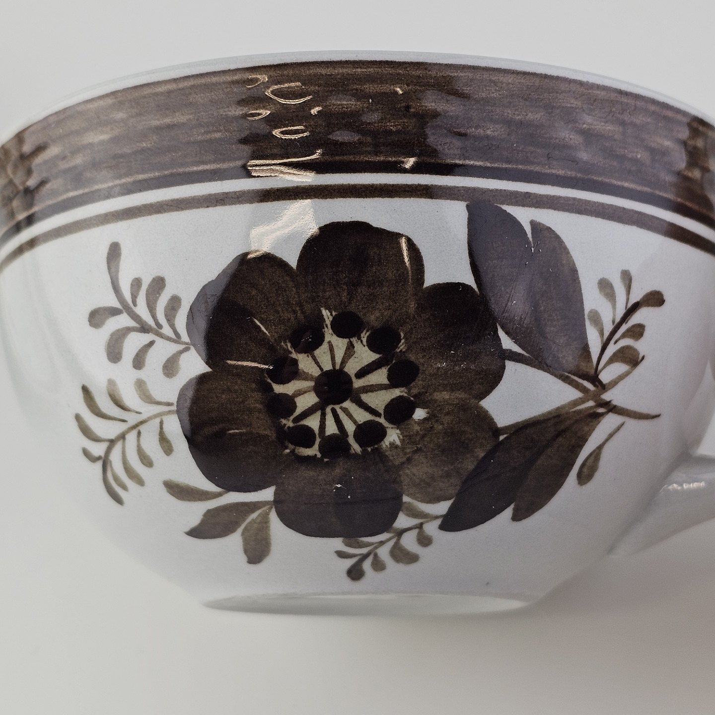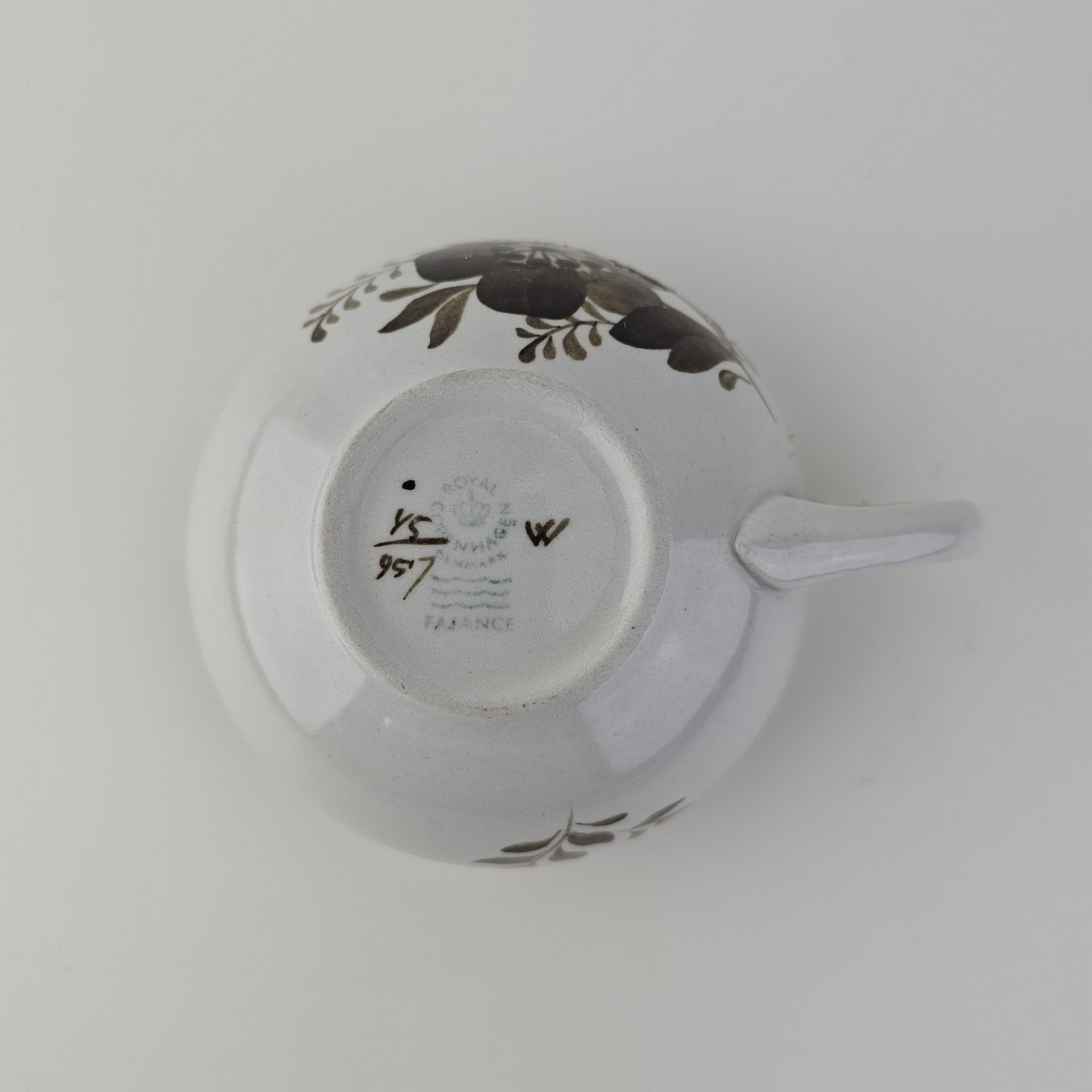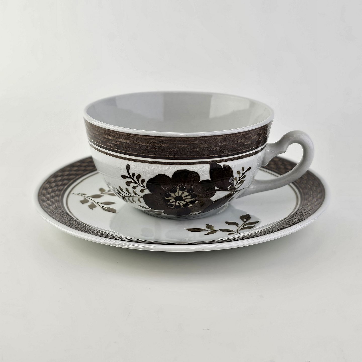 Tekop med underkop i fajance fra stellet Brun Tranquebar fra år 1919
