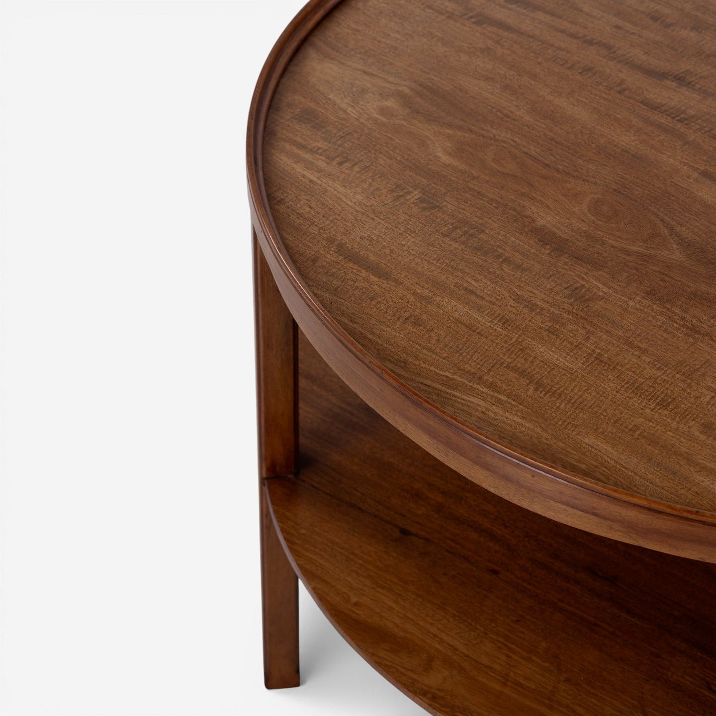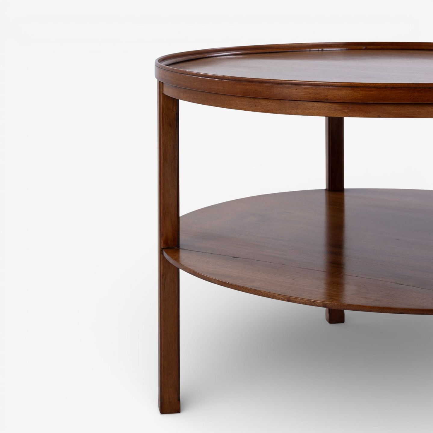 Rundt sofabord i patineret mahogni m. underliggende hylde. Mærket fra producent.