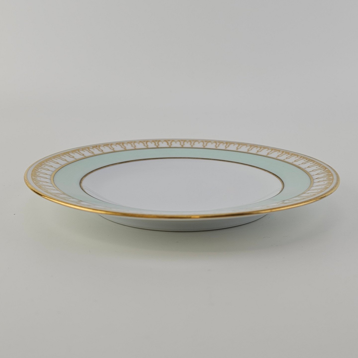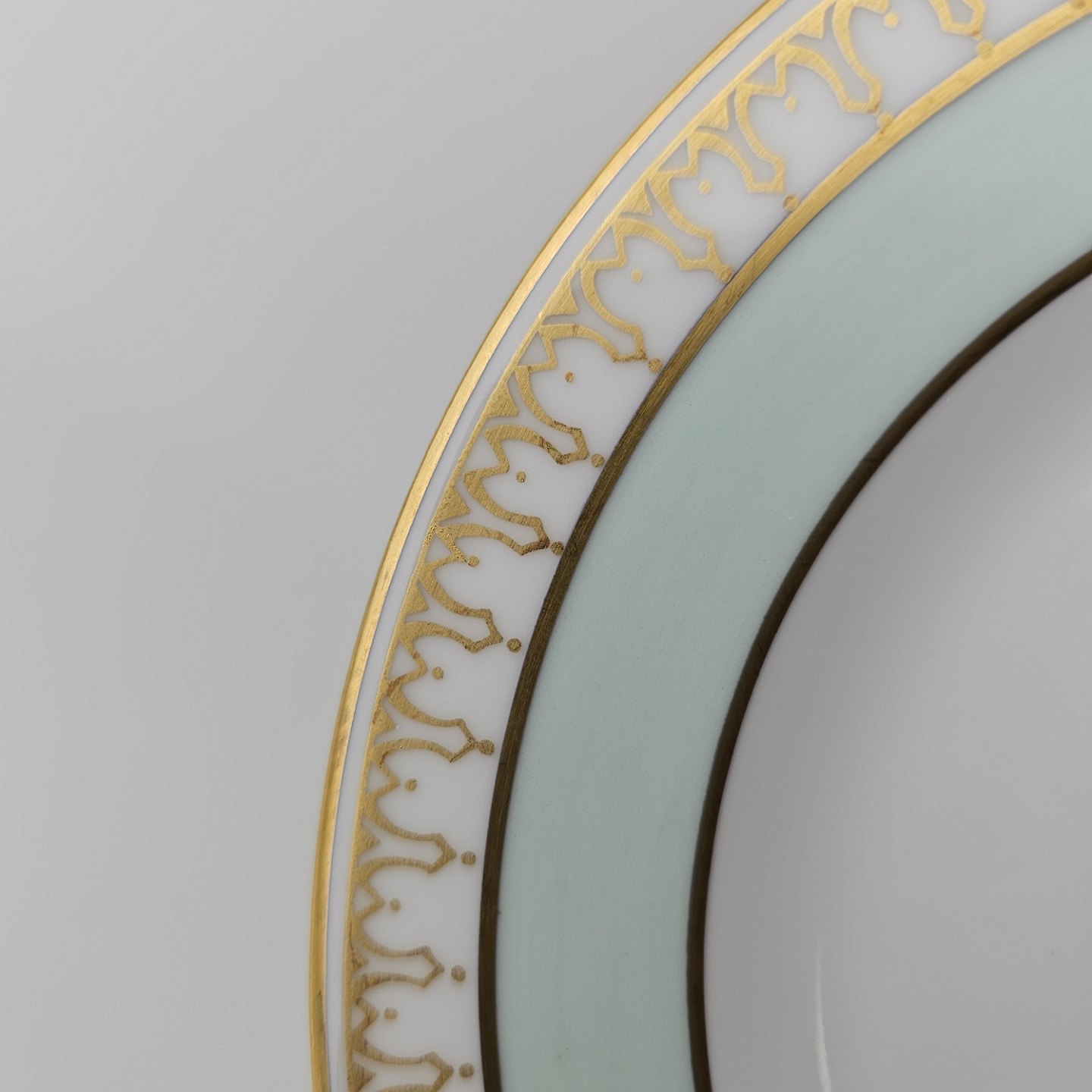 Thorvaldsen er stel i glat hvidt porcelæn med lysegrøn bort, forgyldt dekoration og guldkant