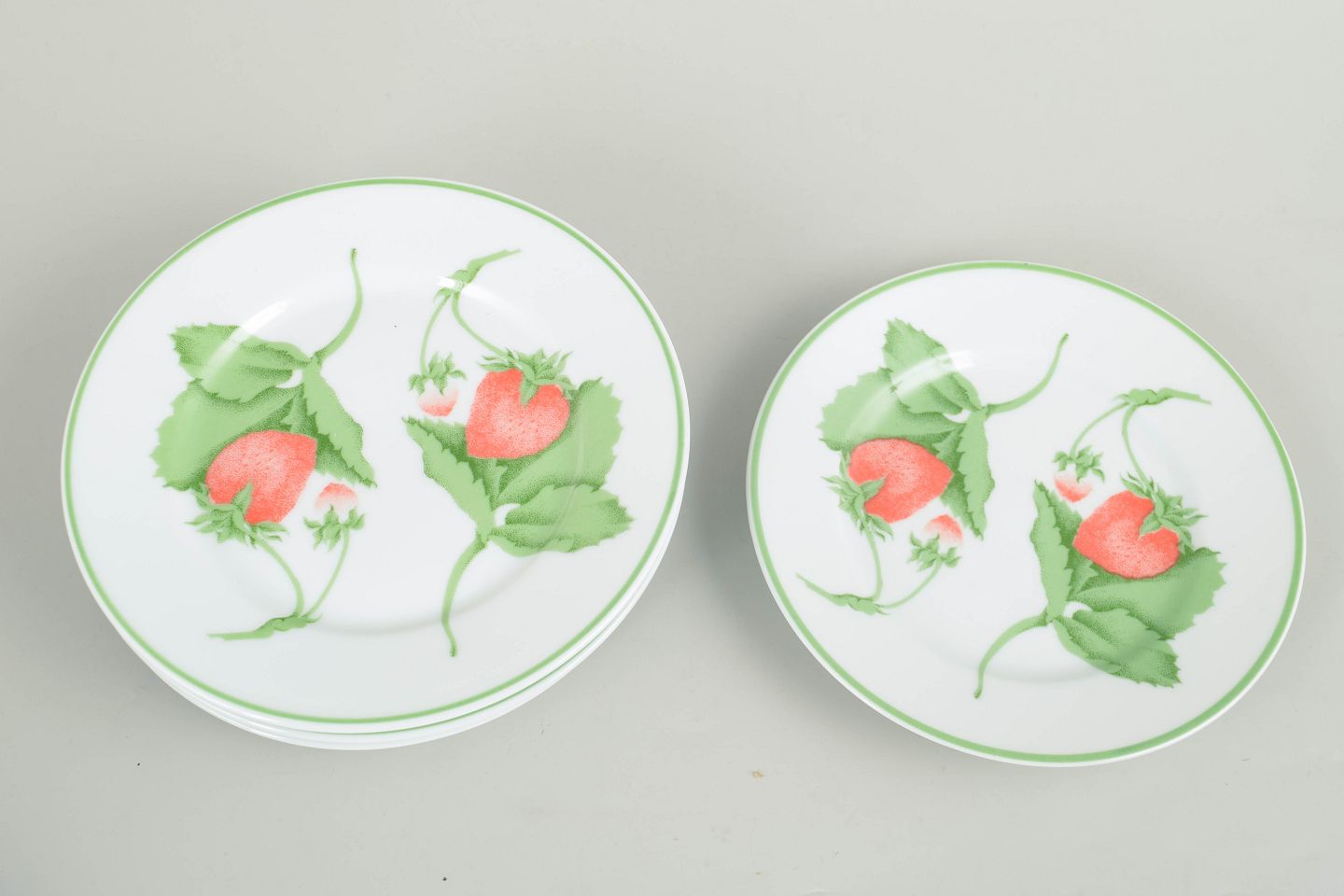 Sæt med seks mindre tallerkener i porcelæn med dekoration af jordbær og blade i serien Fraise.