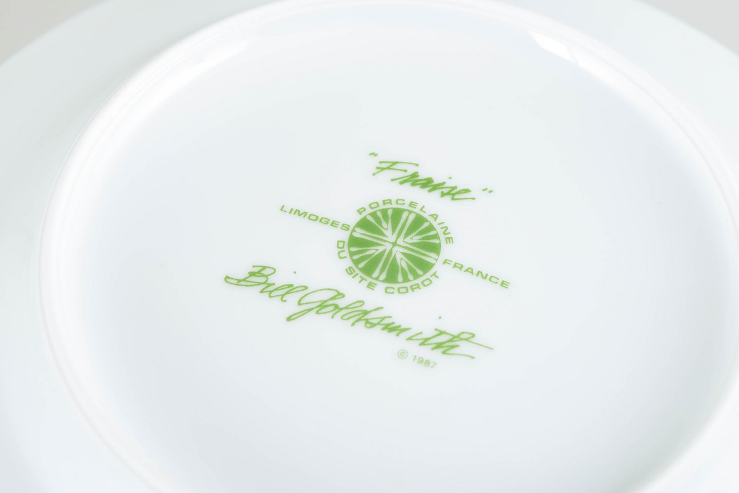 Limoges-porcelæn er kendt for sin fine kvalitet og lange tradition for dekoreret bordservice. I 1980’erne blev frugt- og blomsterdekorationer populære som et let og dekorativt udtryk til hverdags- og serveringsservice. Serien Fraise er et typisk eksempel på denne stil med sit naturalistiske motiv og enkle grønne kant.