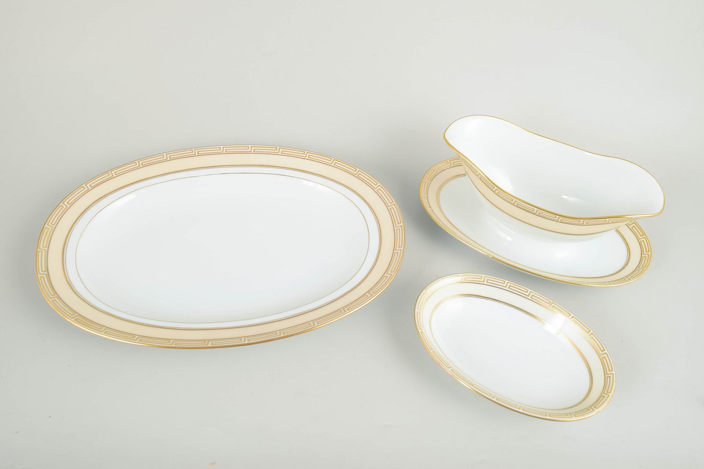 Set in white-glazed porcelain with a gilded rim and geometric Art Deco border; models 317 and 316.