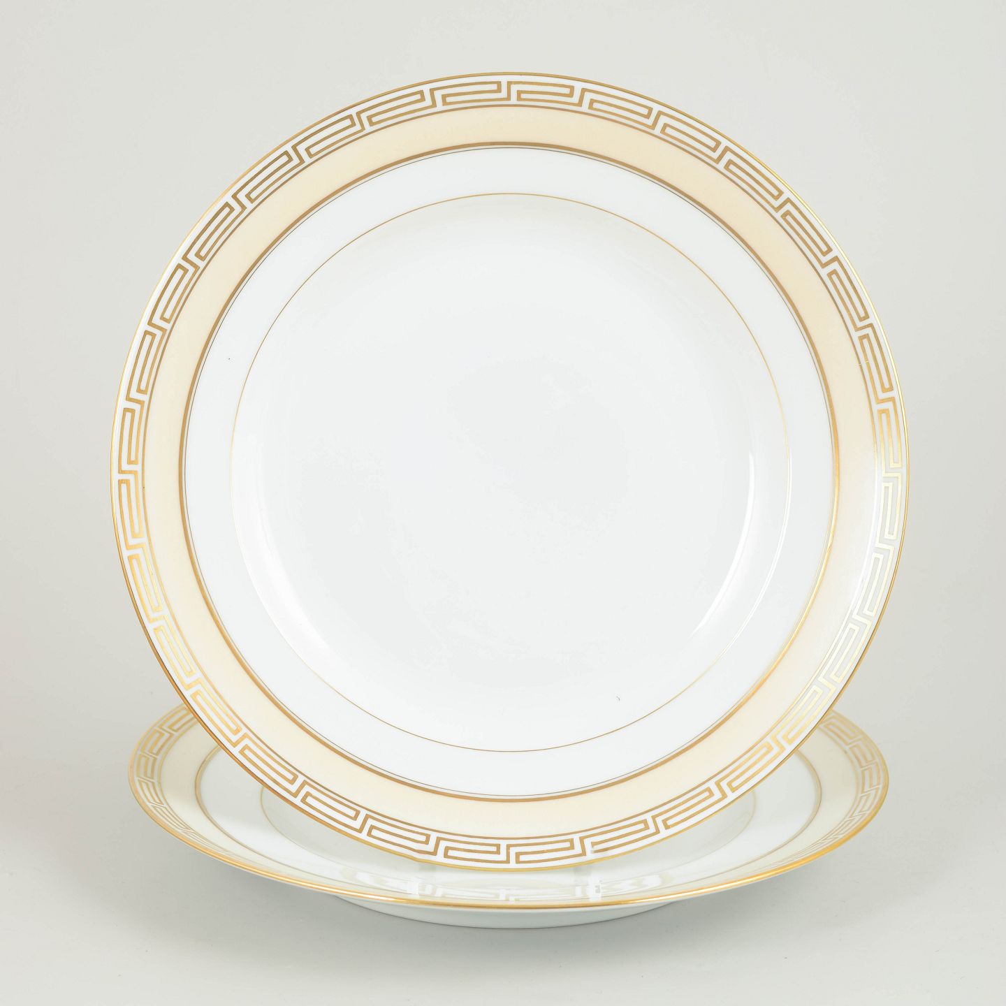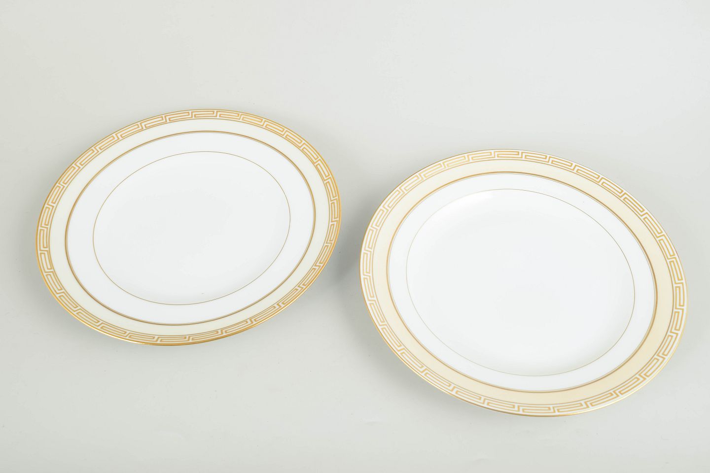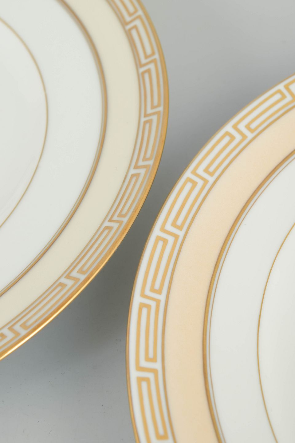 Set of two white porcelain plates with a gilded rim and geometric border in a crisp Art Deco-inspired style; model 25.