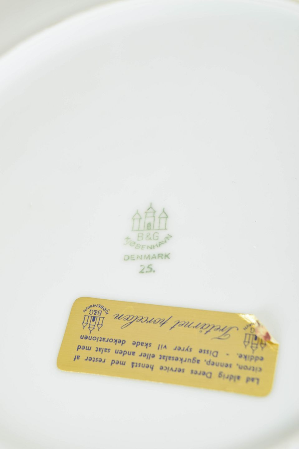 In the interwar period, Bing & Grøndahl produced refined tableware that balanced tradition with the era’s cleaner, more geometric design language. The gilded border and graphic, structured ornamentation are typical of 1920s Art Deco, lending an elegant and formal presence to the table.