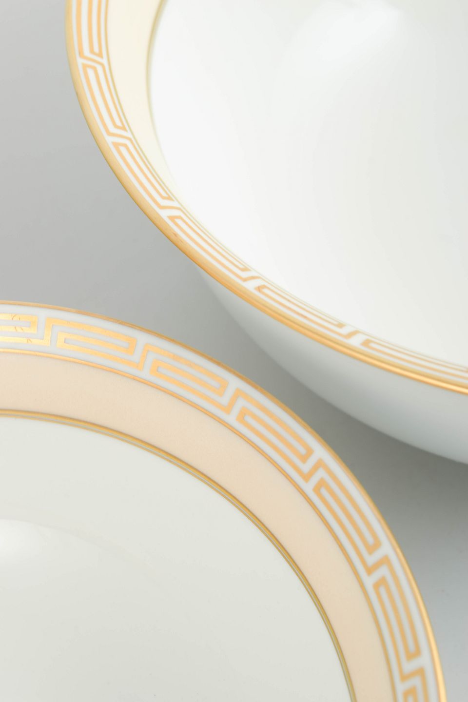 Two bowls in white-glazed porcelain with a gilt geometric border in a classic Art Deco style along the rim.