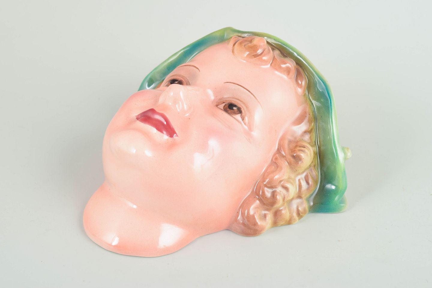 Art Deco vægmaske i glaseret keramik formet som et ansigt; model “Padany”, modelnr. 1694. Stemplet “Wien Keramos” og “Made in Austria”.