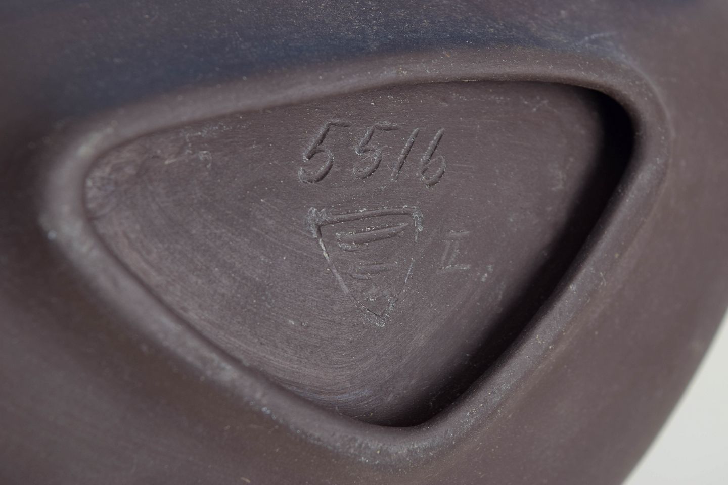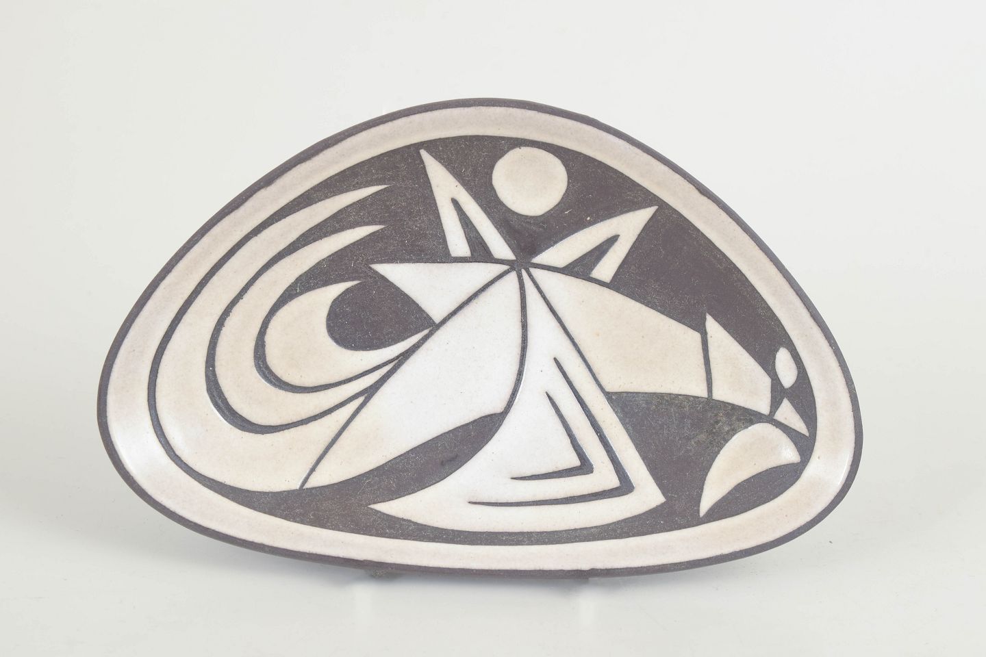 Trekantet skål/fad i stentøj med flad profil og grafisk, abstrakt dekoration i sort på hvid bund. Dekoren har et stramt, modernistisk udtryk med kontrastflader og stiliserede former. Model 5516, stemplet under bunden.