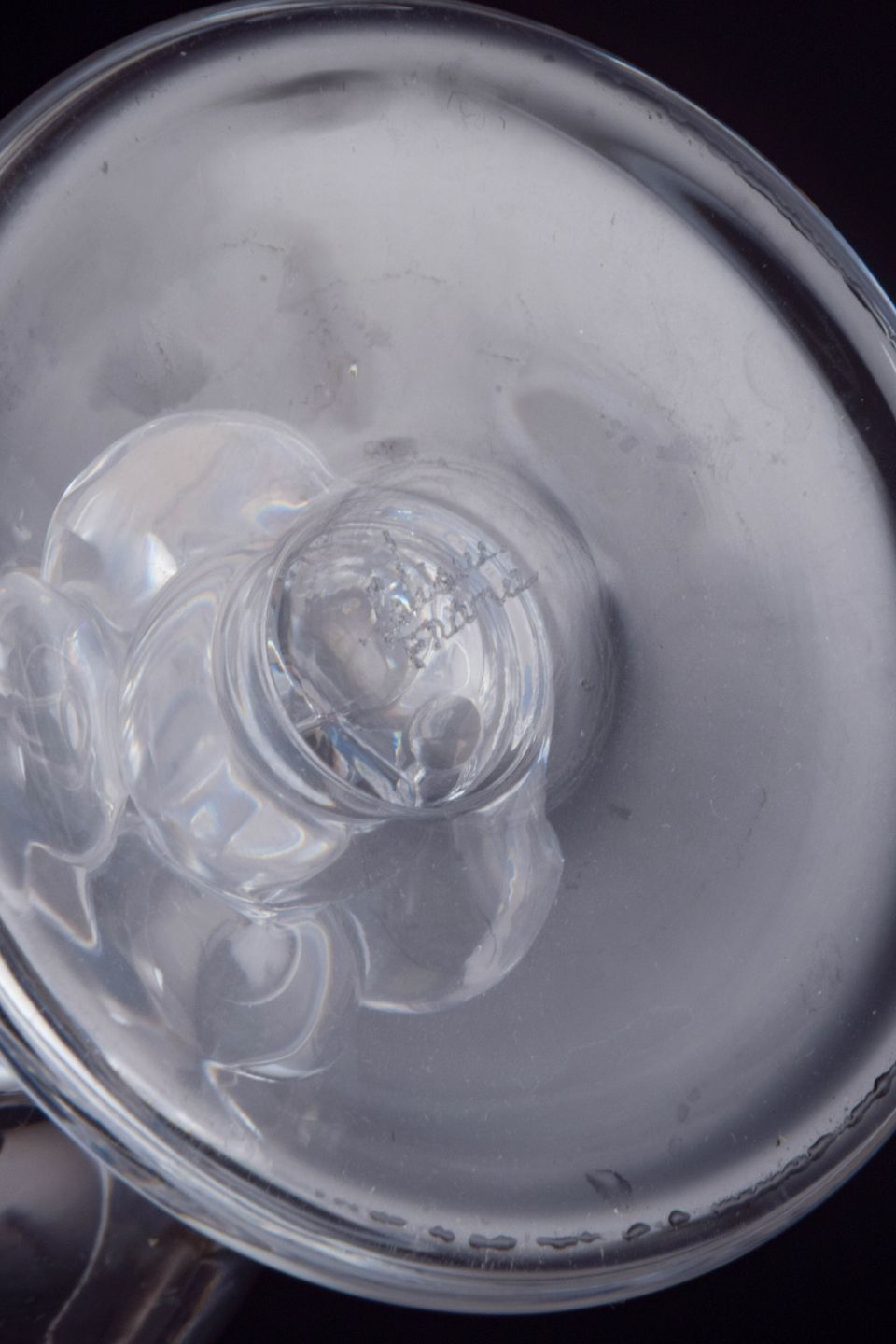 Sæt med fire store og sjældne vinglas i klart formpresset glas med facetslebet kumme og stilk udformet som drueklase. Modellen “Clos Vougeot” er udført med elegant Art Deco-inspireret symmetri, hvor de dekorative former både har en skulpturel og funktionel karakter. Glassene er signeret i bunden.