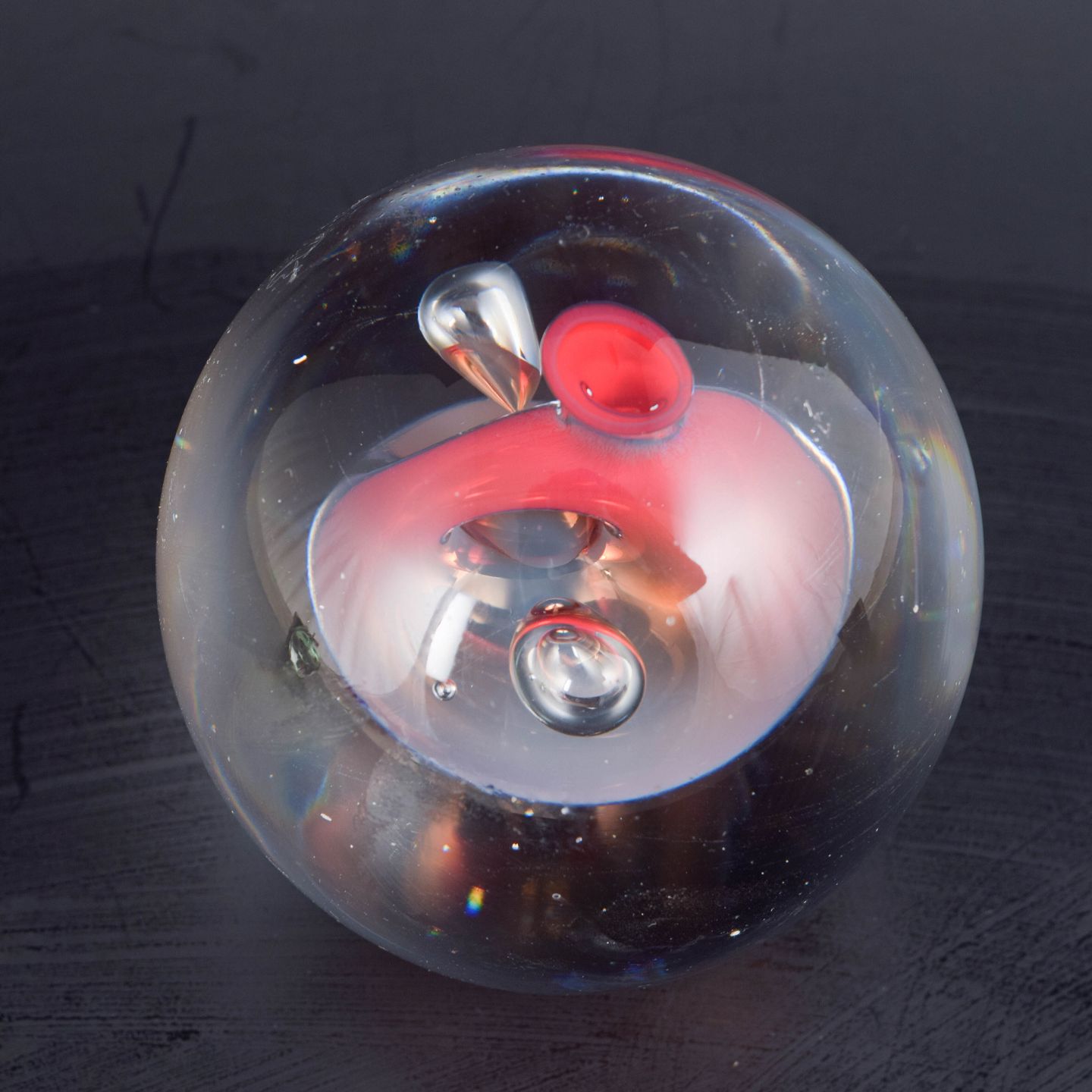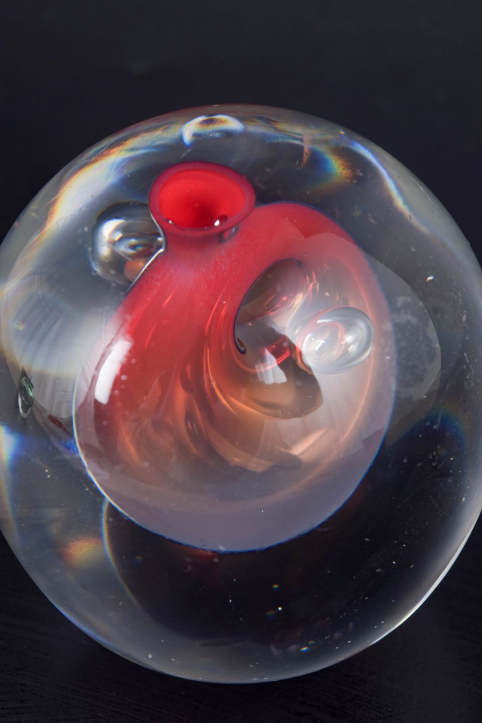 Skulpturelt glasobjekt i klart glas med indkapslet rød form og optisk “linse”-effekt i centrum, udført som mundblæst studioglas med fokus på volumen, lysbrydning og dybdevirkning.