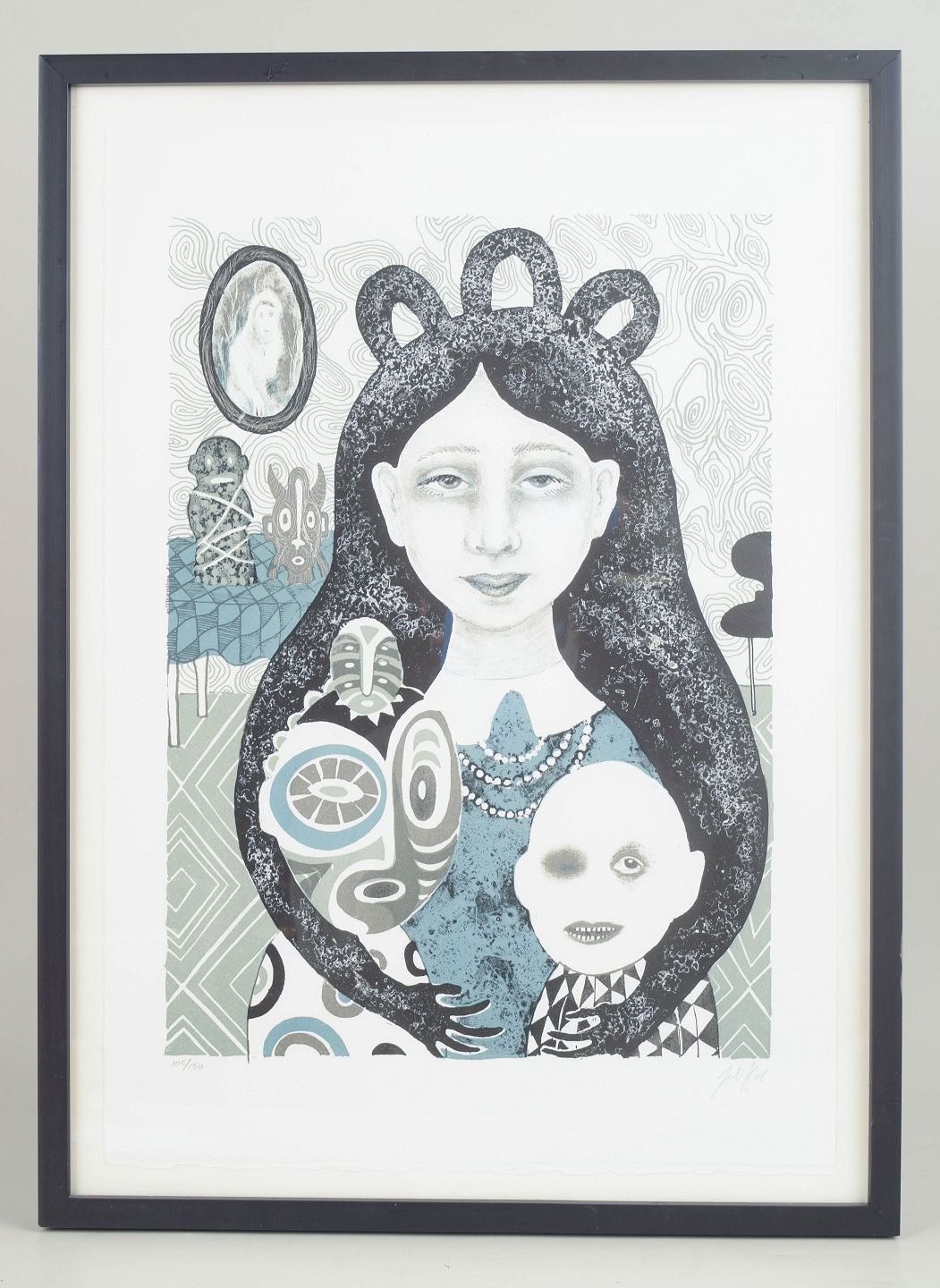 Maleriinspireret motiv med figurative og ornamentale elementer udført som farvelitografi, signeret og nummereret 105/150.