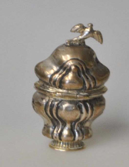 Hans Christensen Nyested (1712 - 1787) Horsens, Danmark: Skævknækket rococo hovedvandsæg i sølv. Med due som topfigur. Indvendig lueforgyldt. Stemplet i bunden.