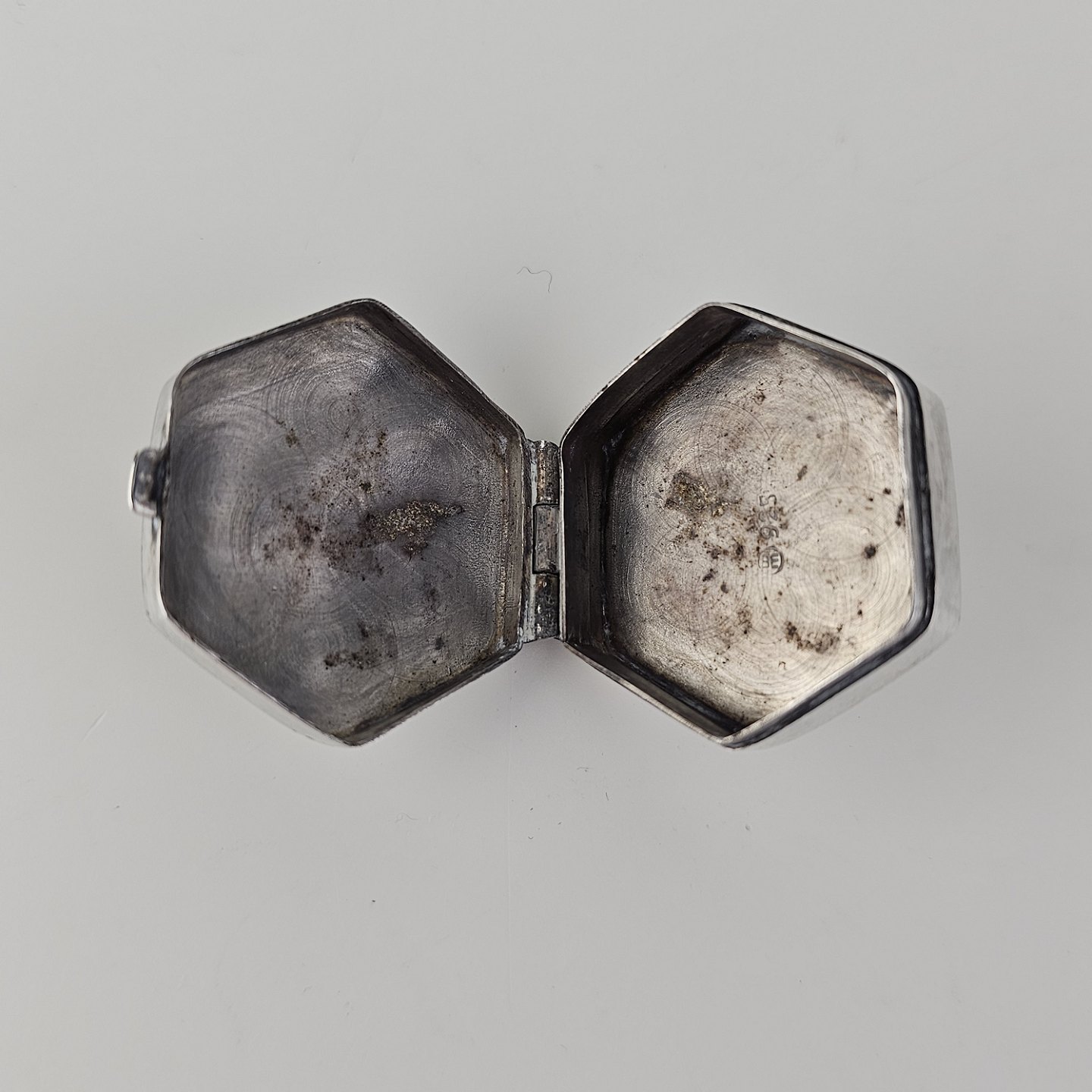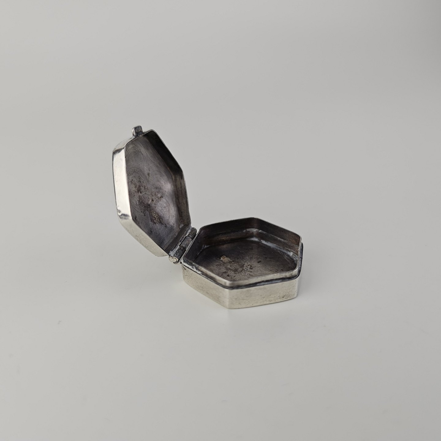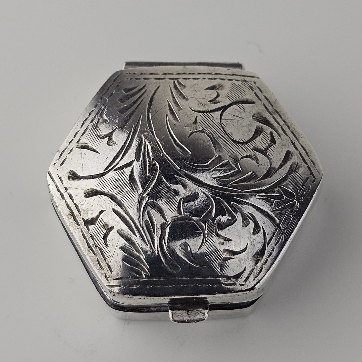 Sekskantet pilleæske i sterling sølv med indgraveret bladmotiv