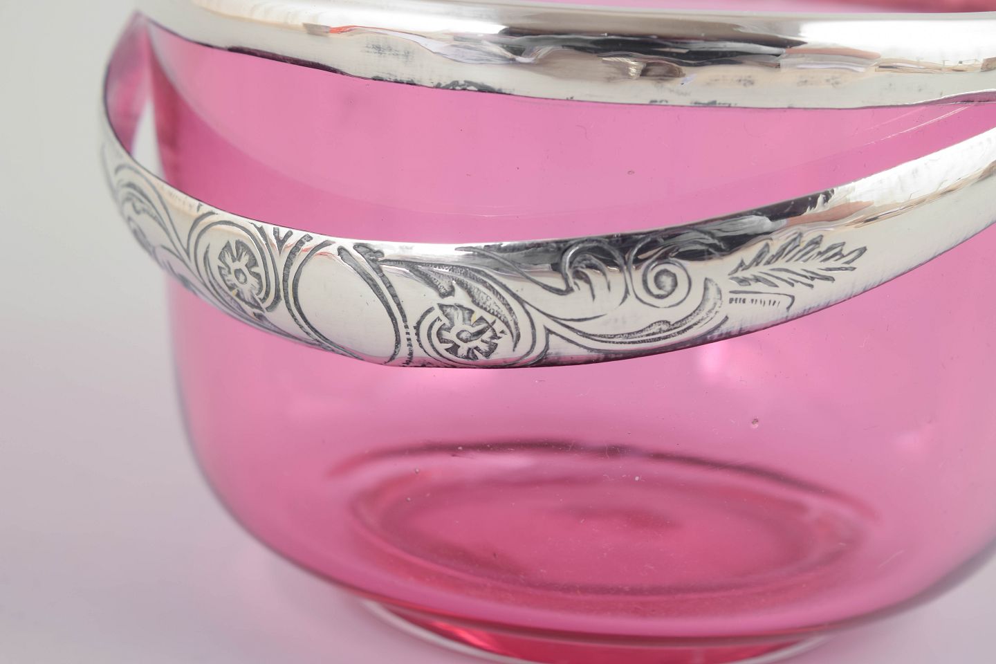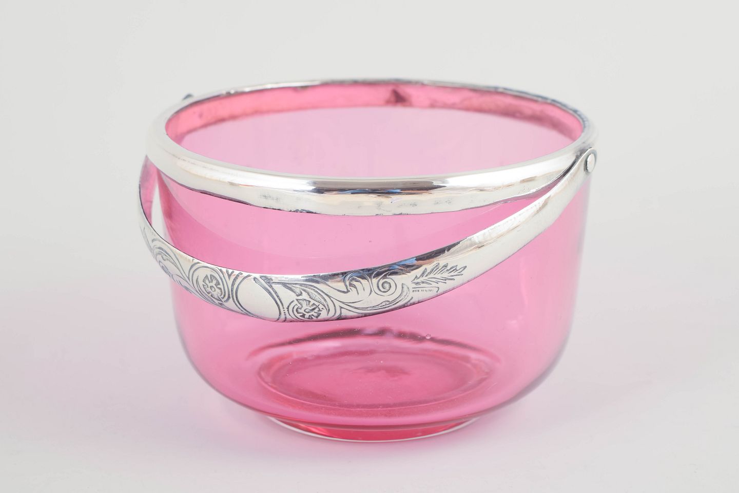 Rund skål i rosa glas med påsat forsølvet metalhank udført i enkel, funktionel form med let transparent gods.