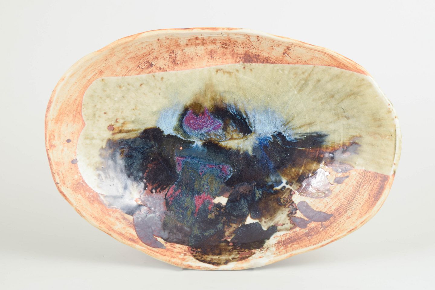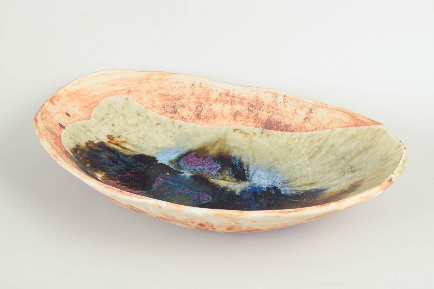 Unik, organisk formet skål i drejet stentøj med levende, abstrakt dekoration og flerfarvet glasur i jordfarver og blålige nuancer.