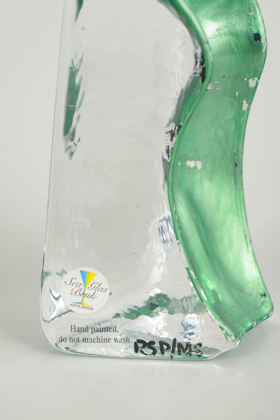 Både Kosta Boda og Sea Glasbruk var i 1980’erne kendt for svensk kunstglas med stærke farver og legende, figurative motiver. Produktionen var præget af mundblæste former med indkapslede figurer og håndmalede grafiske detaljer, hvilket gav et karakterfuldt og let genkendeligt udtryk. Sådanne værker forener studioglastradition med dekorativt design og er i dag attraktive samlerobjekter.