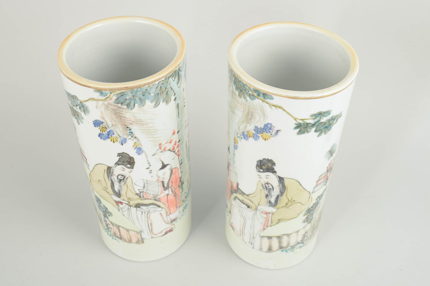 Par cylindriske vaser i porcelæn, hånddekoreret med figurscener i emaljefarver samt kalligrafi og segl. Den kalligrafiske tekst kan oversættes til: “Blomsternes duft er ren og vidtrækkende; de elegante blomster afspejler en forfinet smag og udtrykker ro, harmoni og samklang mellem natur og menneske.”