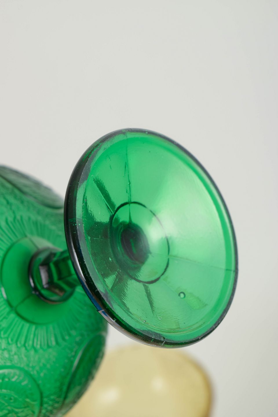 Presset glas fra 1930’erne er kendetegnet ved dekorative relieffer og klare farver, ofte inspireret af Art Deco-periodens formsprog. Skåle på fod blev anvendt til desserter og servering og kombinerer funktion med et markant dekorativt udtryk, som i dag gør dem eftertragtede som både brugs- og samlerobjekter.
