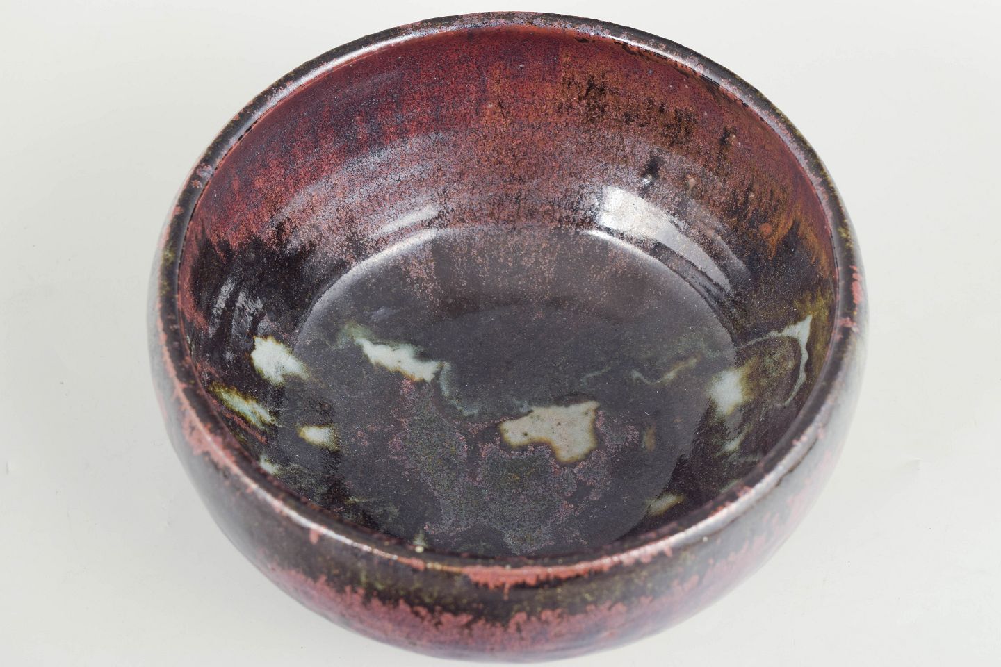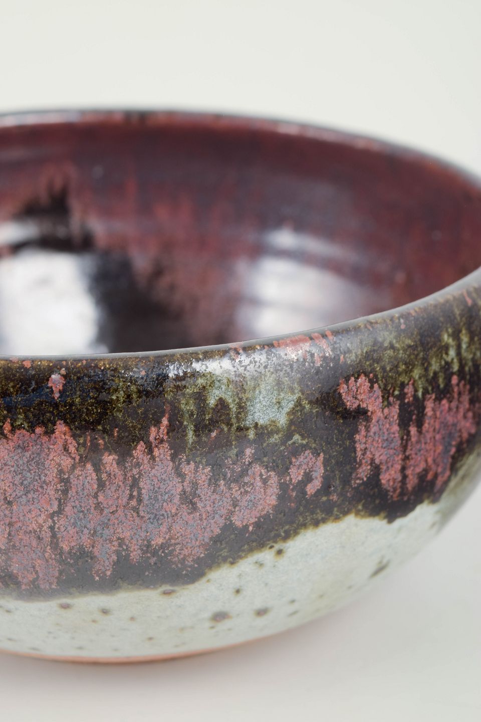 Unik, drejet skål i stentøj med kraftig, løbende glasur i dybe bordeauxrøde og mørke toner over lys bund, udført som et enkeltstående studiearbejde.