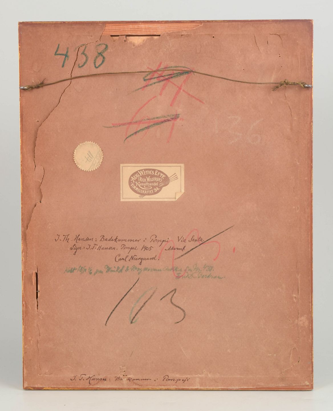 Arkitektonisk motiv fra Pompeji med klassiske bygningsfragmenter og rumlige perspektiver, udført som akvarel i dæmpede jordfarver og varme okkertoner. Signeret og dateret, Pompeji 1905.