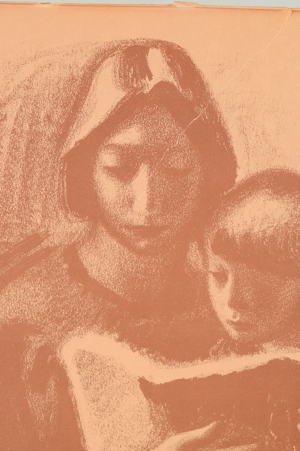 Figurativ fremstilling med moder og barn, udført i et blødt, stemningsfuldt grafisk udtryk med tydelig social og humanistisk karakter. Signeret og dateret 1949.