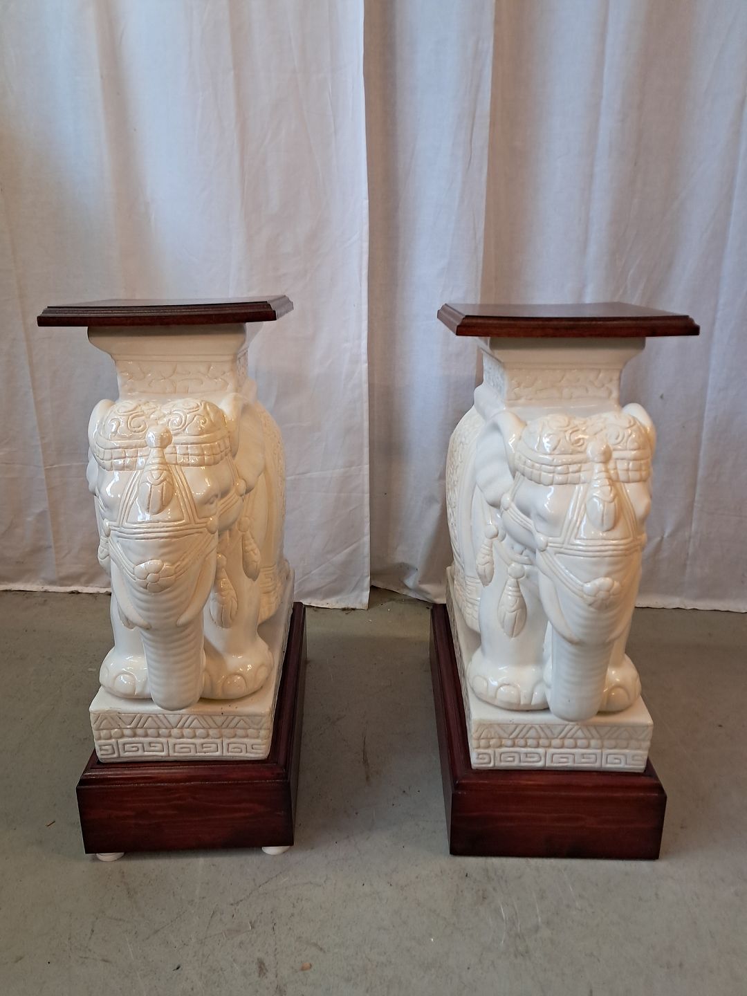 2 Pocelæns-elefanter med træsokkel og topplade, fra 2000erne.