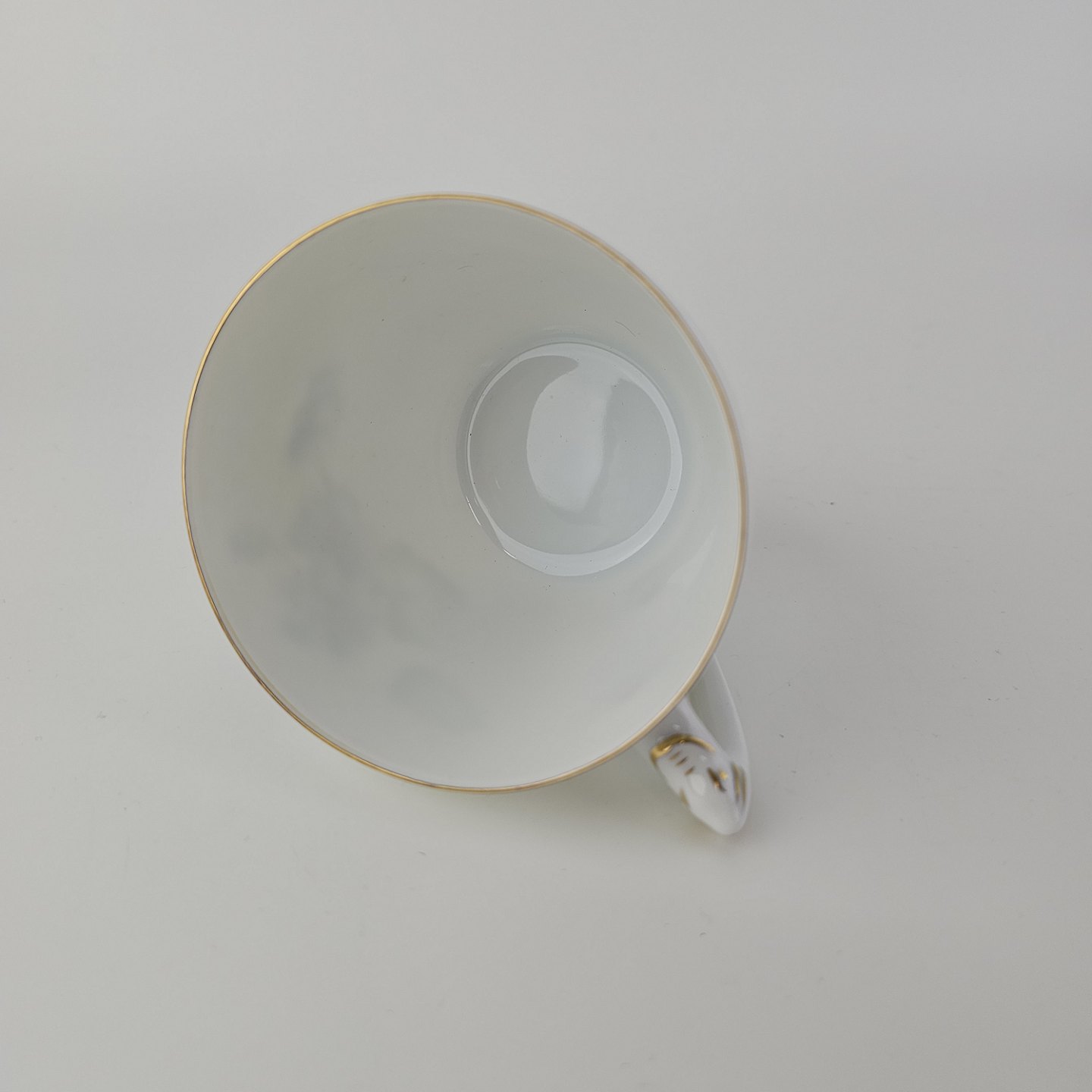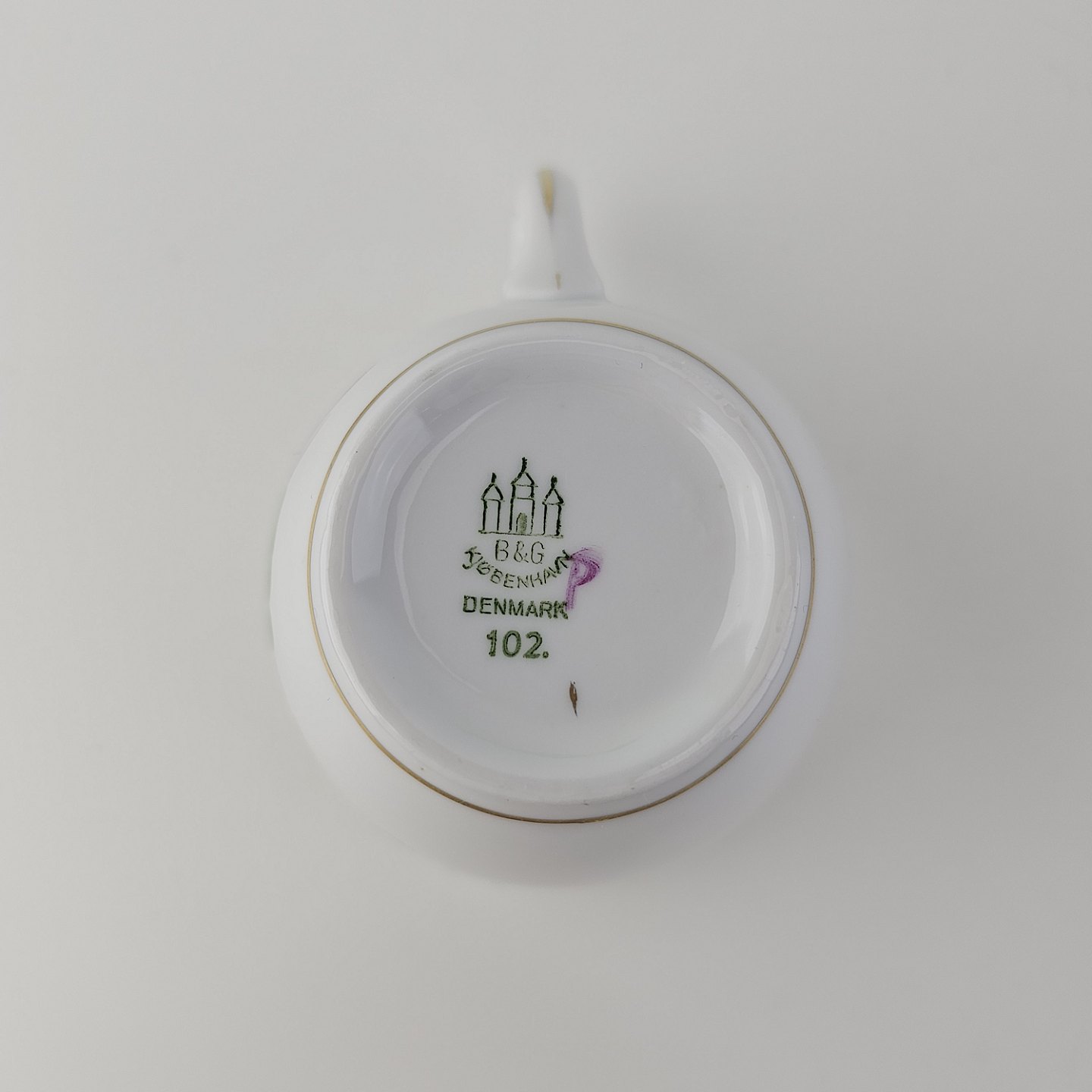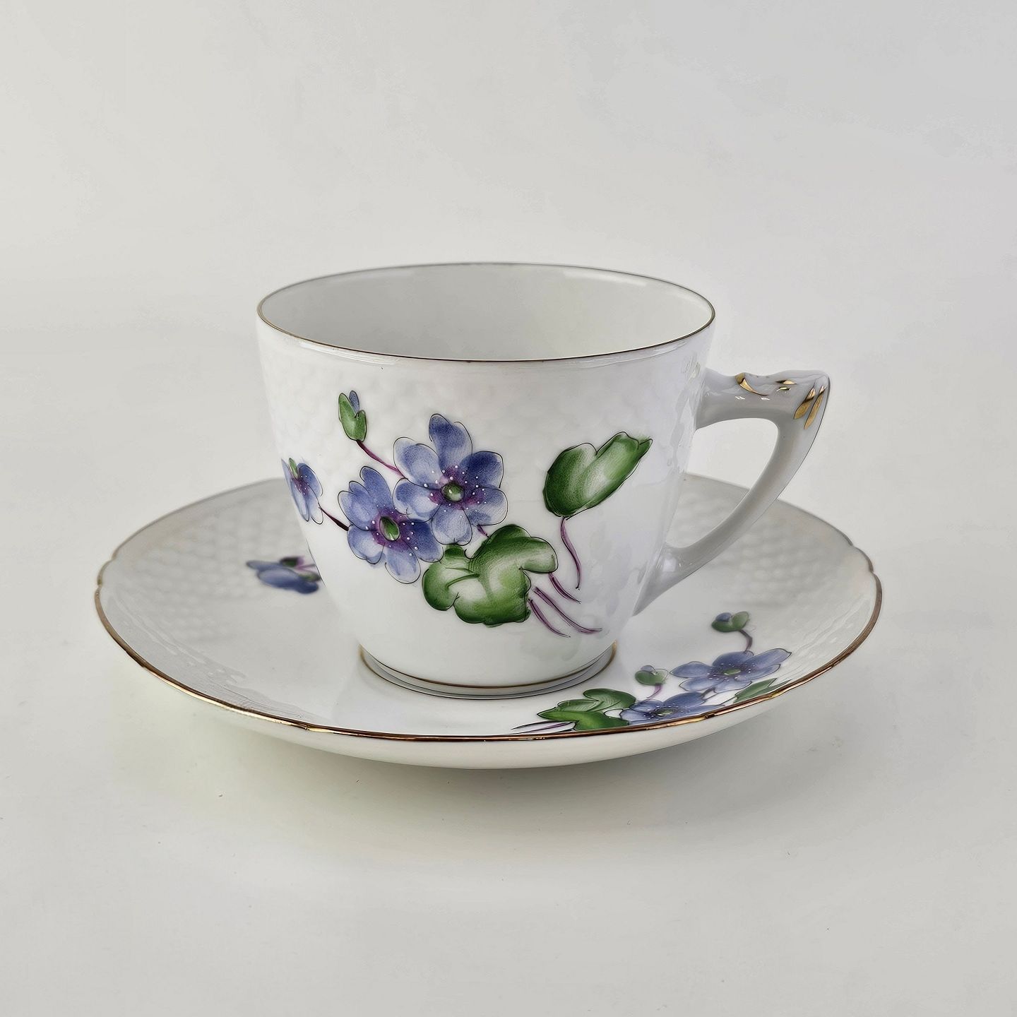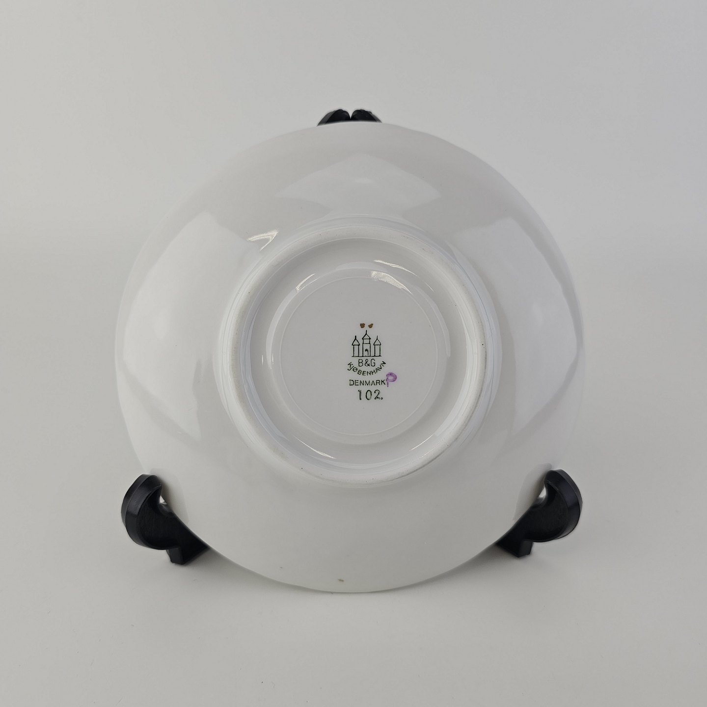 Antonius er af hvidt porcelæn med skælform dekoreret med håndmalede blå anemoner og guldkant
