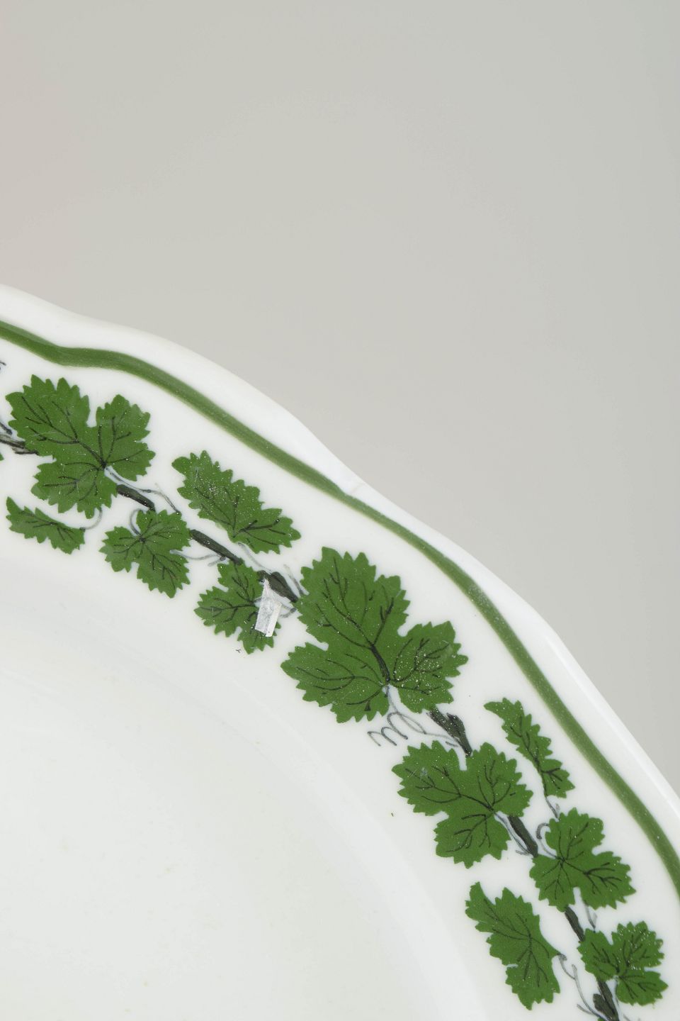 Runde porcelænstallerkener dekoreret med grøn vinløvsbort langs kanten. Nogle eksemplarer annulleret med to indridsede streger, andre med fire indridsede streger. Mærket med Meissens krydsede sværd. Én tallerken med et meget lille og ubetydeligt skår, se foto.