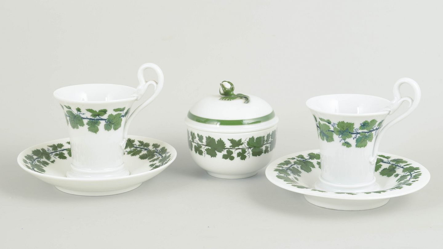 Et par kaffekopper med svanehank og tilhørende underkopper samt sukkerskål i porcelæn, dekoreret med grøn vinløvsbort. Nogle dele i første sortering, andre annulleret med to indridsede streger. Mærket med Meissens krydsede sværd.