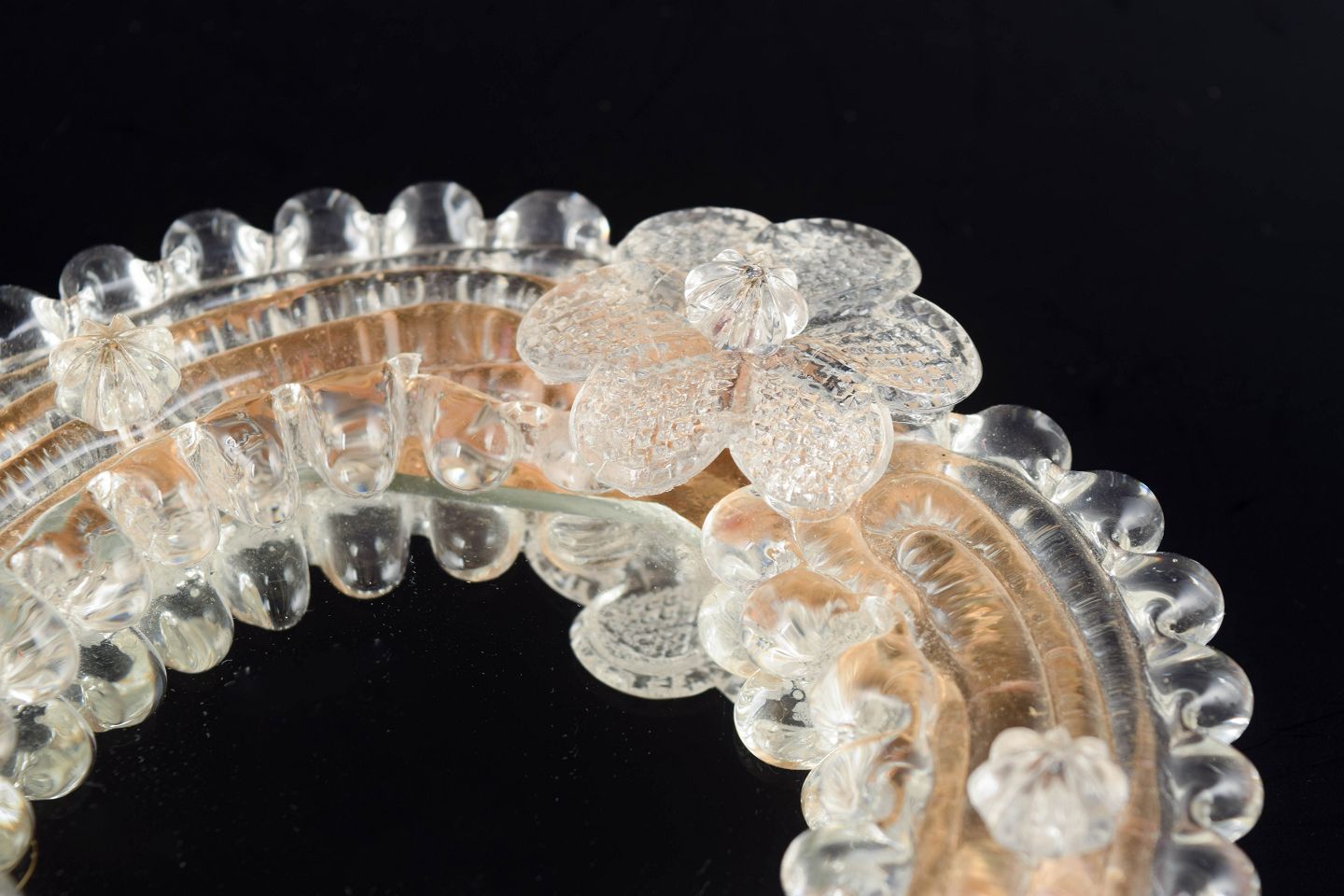 Murano har siden renæssancen været centrum for venetiansk glaskunst og er især kendt for sin tekniske kunnen og dekorative opfindsomhed. I 1950’erne og 60’erne blev spejle med kunstneriske glasrammer populære, ofte udført med blomster, perler og organiske elementer i klart og farvet glas. Disse spejle blev fremstillet i mindre værksteder og kombinerer traditionelt håndværk med tidens dekorative formsprog, hvilket gør dem eftertragtede samlerobjekter i dag.