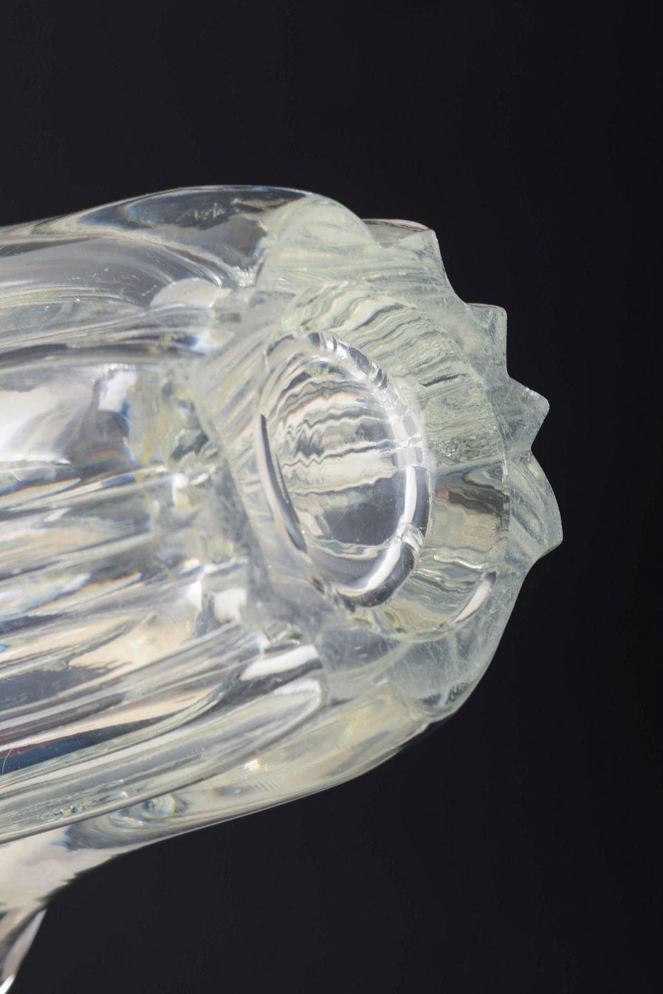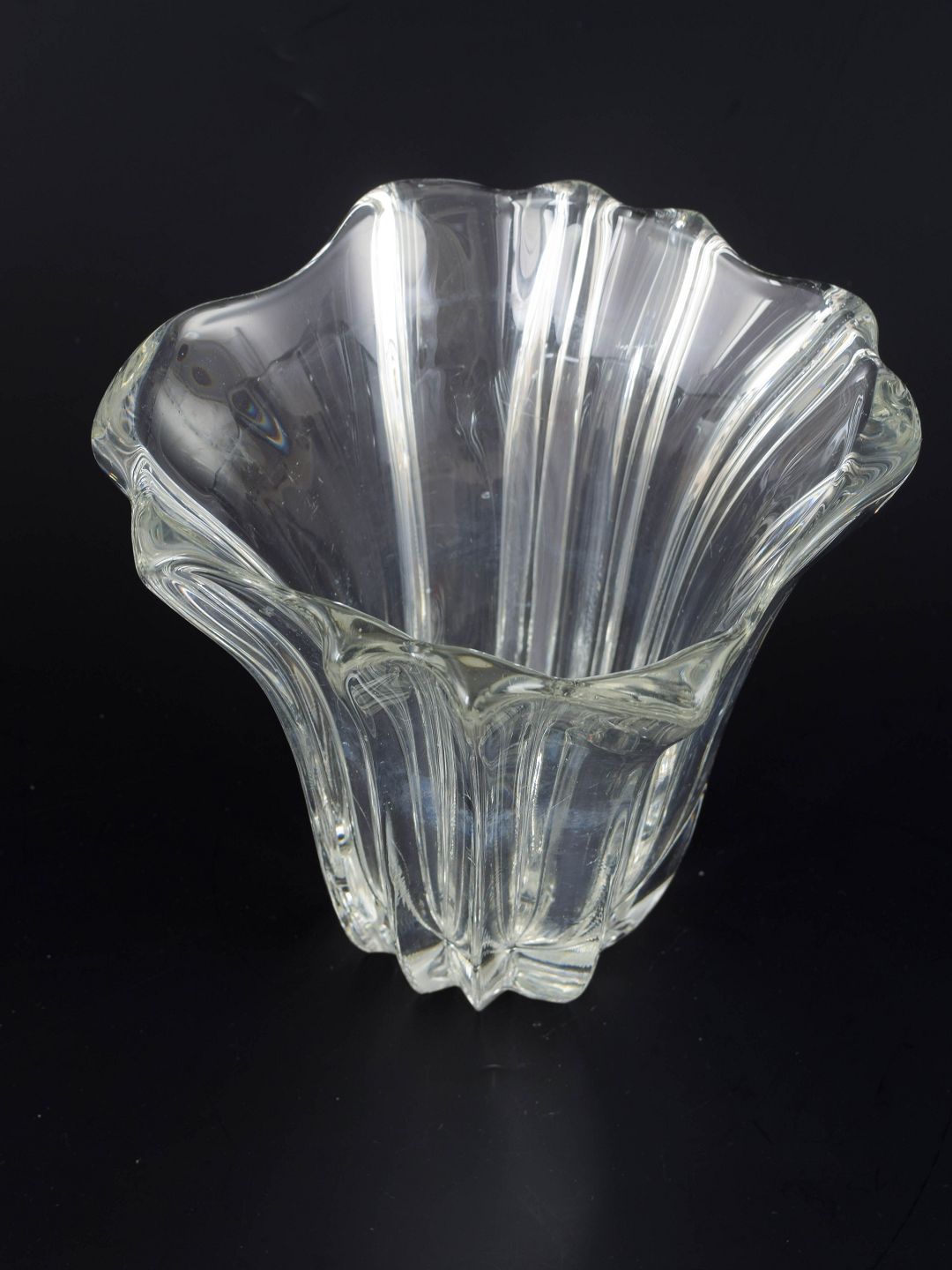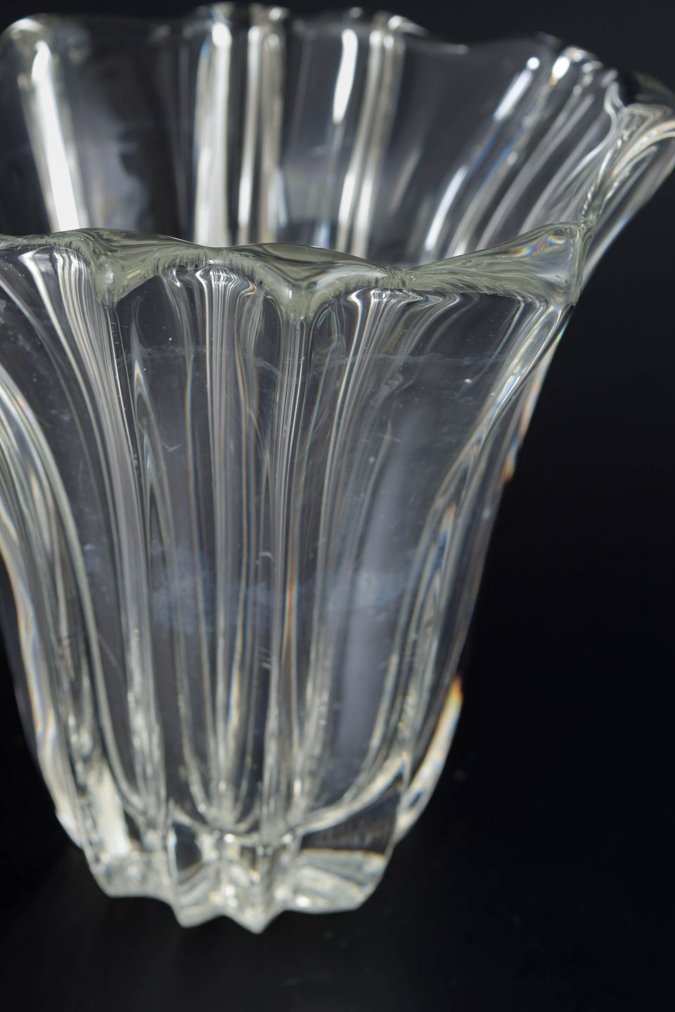 Fransk art deco-vase i presset klart glas med lodrette, svungne ribber og let bølget munding. Modellen fremstår usigneret, hvilket er typisk for en del af Pierre d’Avesns produktion i 1930’erne.