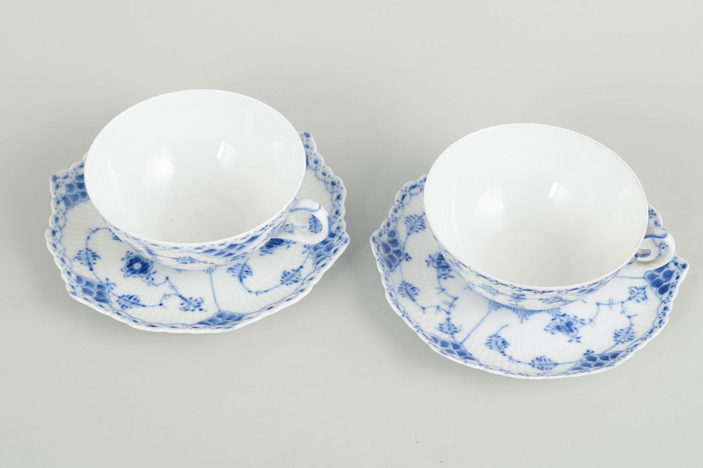 To tekopper med matchende underkopper i håndmalet underglasurblå dekoration i Musselmalet helblonde, med gennembrudt blondedekoration langs kant. Kop og underkop model 1/1130. Annulleret med én og to indridsede streger.