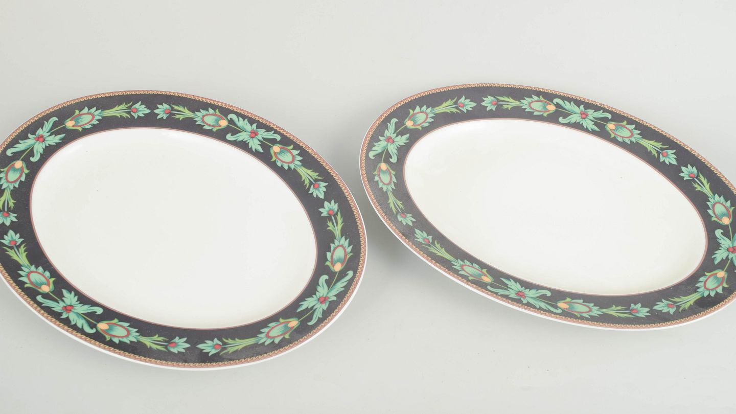 Sæt med to ovale fade i porcelæn fra Rosenthal Classic, dekoreret i serien Mayfair med mørk bort, stiliserede grønne bladranker og gulddetaljer, produceret i 1980’erne.