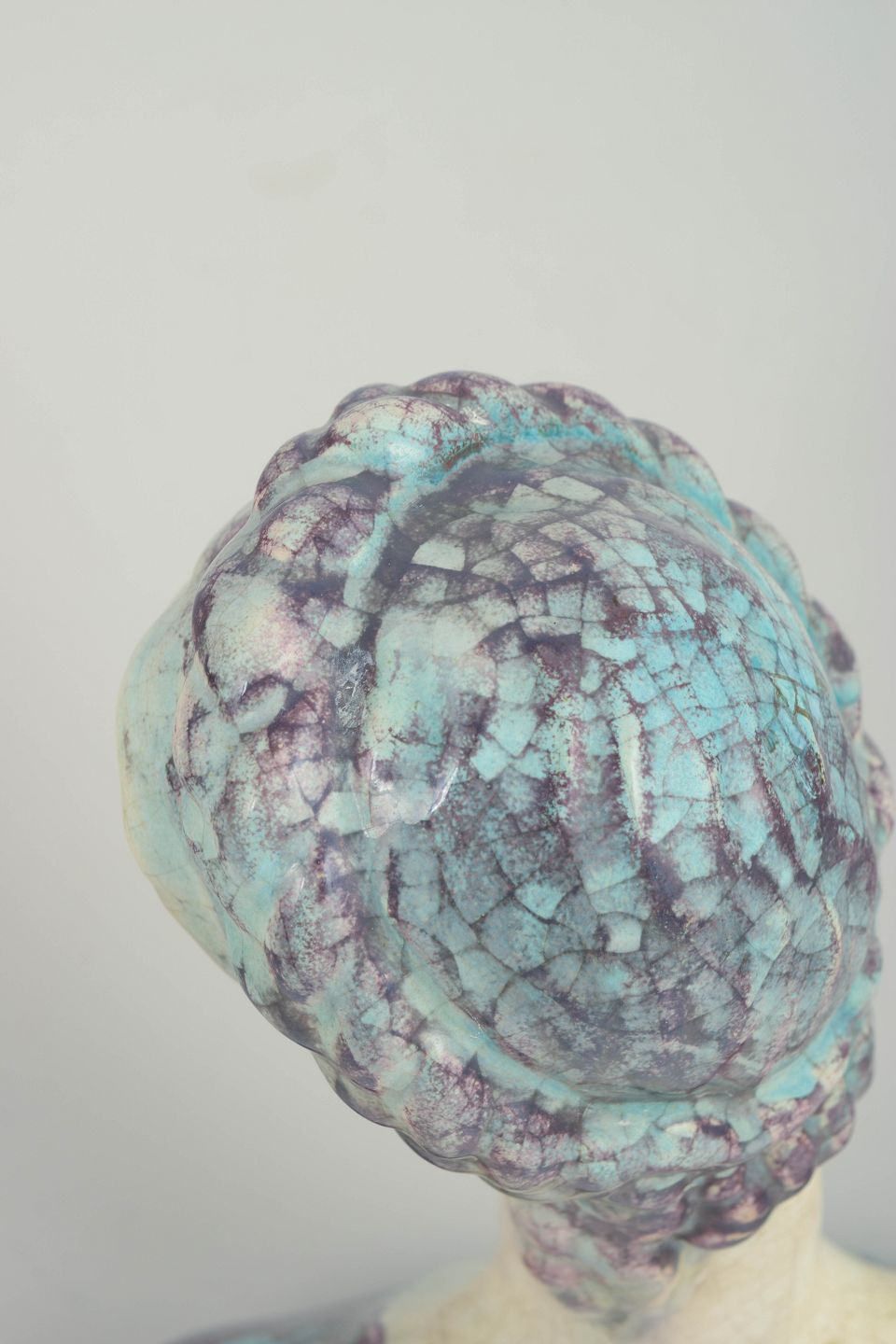 Elegant kvindebuste i stentøj udført i Art Deco-inspireret stil med stiliseret hår og let nedadbøjet hoved. Glaseret i dæmpede, krakelerede nuancer af creme, violet og turkis. Fremstillet på Bornholm og stemplet under bunden med værkets ovale M.A.&S.-mærke.