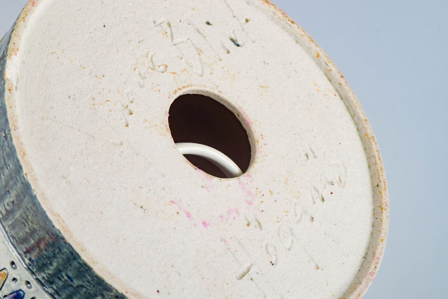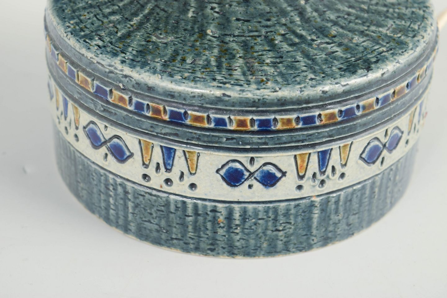 Håndlavet lille bordlampe i glaseret stentøj med balusterformet hals og bred, lav fod. Dekoreret med et bånd af geometriske motiver i blå, gule og brune toner under en grågrøn glasur.