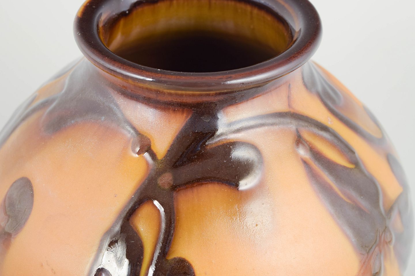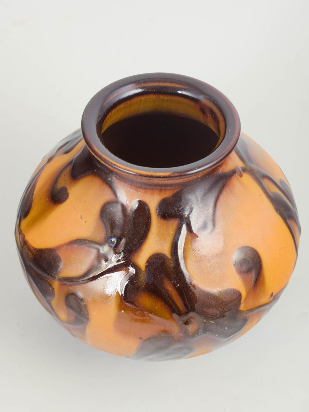 Stor rundbuet vase i glaseret stentøj udført i den karakteristiske ko horn-teknik, hvor flydende glasurer i varme rav- og bruntoner er trukket og manipuleret i bløde, organiske bevægelser over overfladen. Modellen er udført i en generøs størrelse, som fremhæver glasurens dybde og levende spil.
