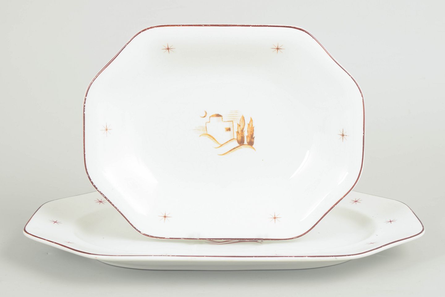 Fade i glaseret fajance med bølget form, brun kantstreg og stjernemotiver samt centralt orientalsk landskabsmotiv. Model Orient. To størrelser.