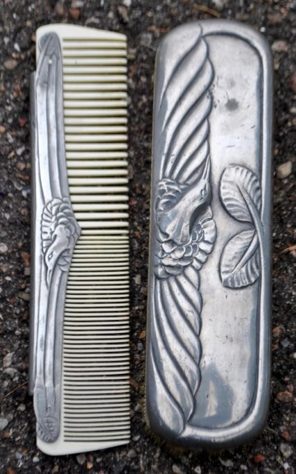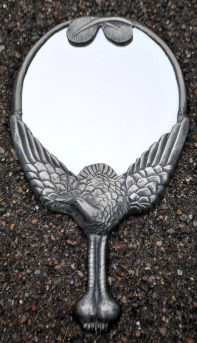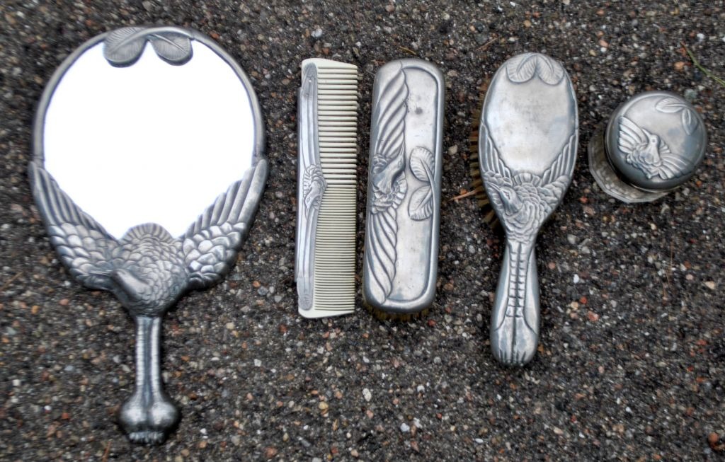 Hertz/Mogens Ballin toilet set in pewter, art deco, design 1719. approx. 1920. Copenhagen, Denmark. Consisting of mirror, comb, 2 brushes and lidded jar. Decoration with crane and foliage. Mirror length: 33 cm. Stamped.