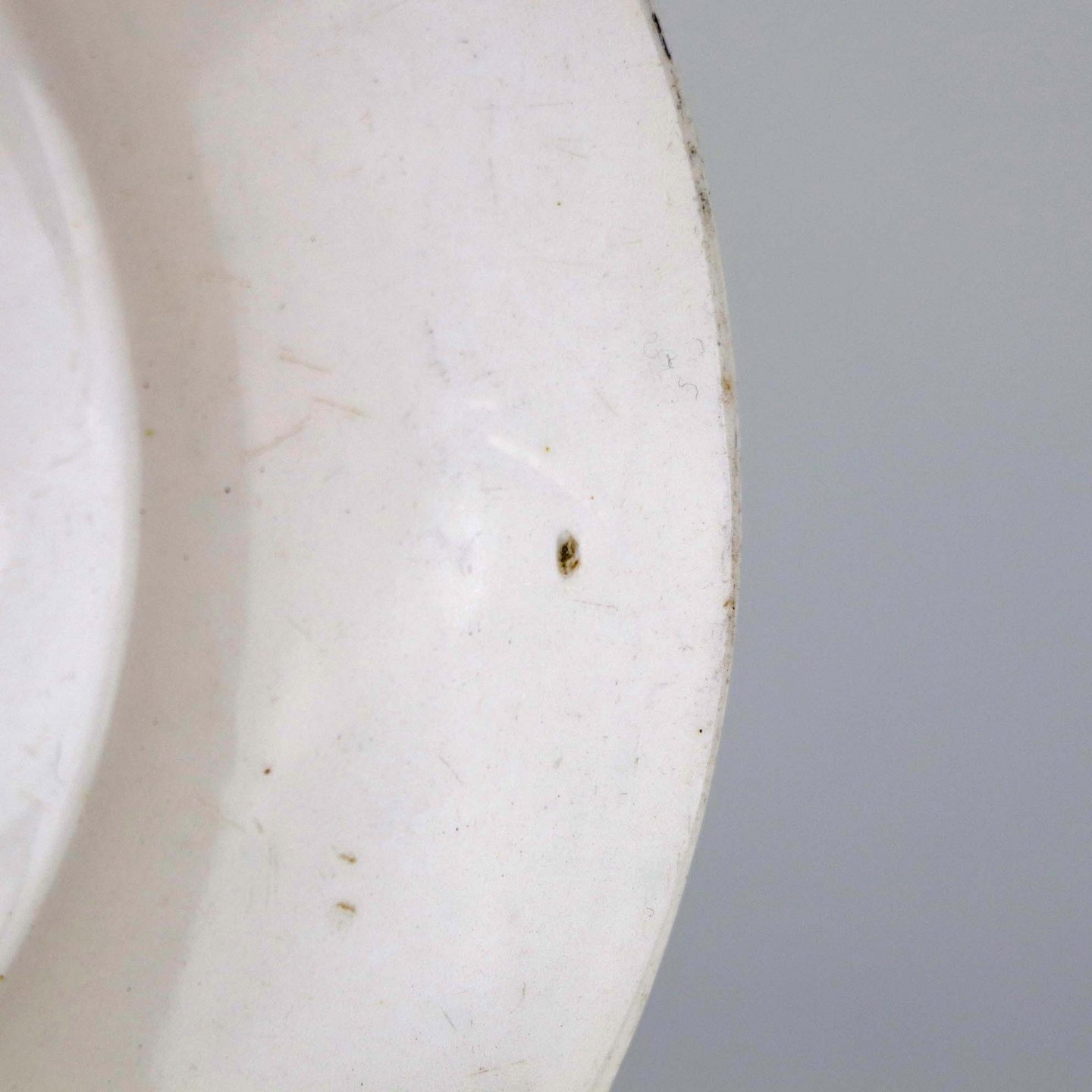 Fremstår med mørkning og ujævnheder i glasuren samt ridser på topsiden af fadet.