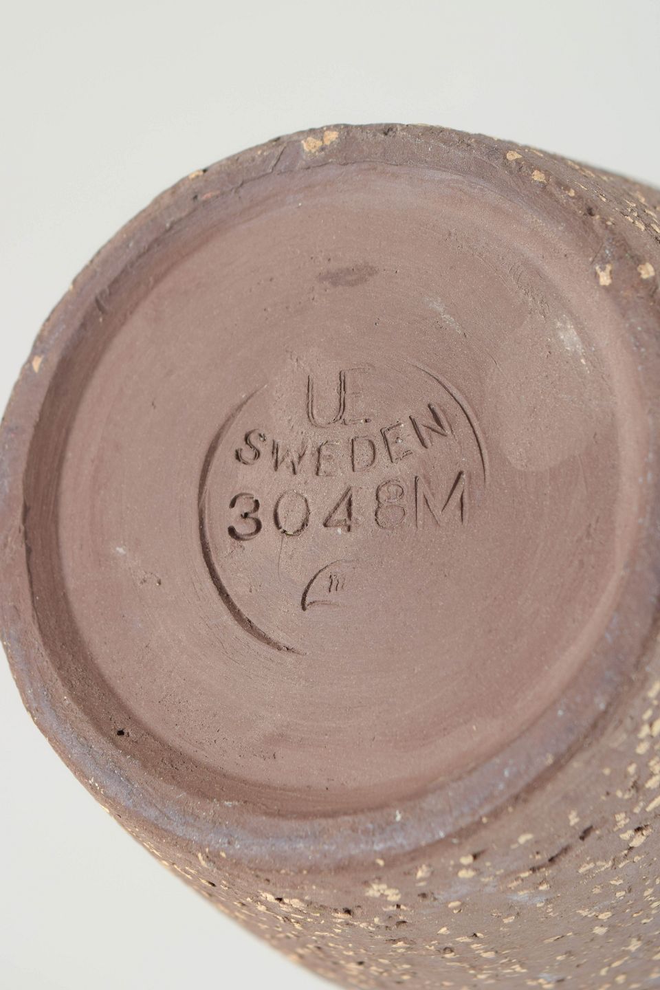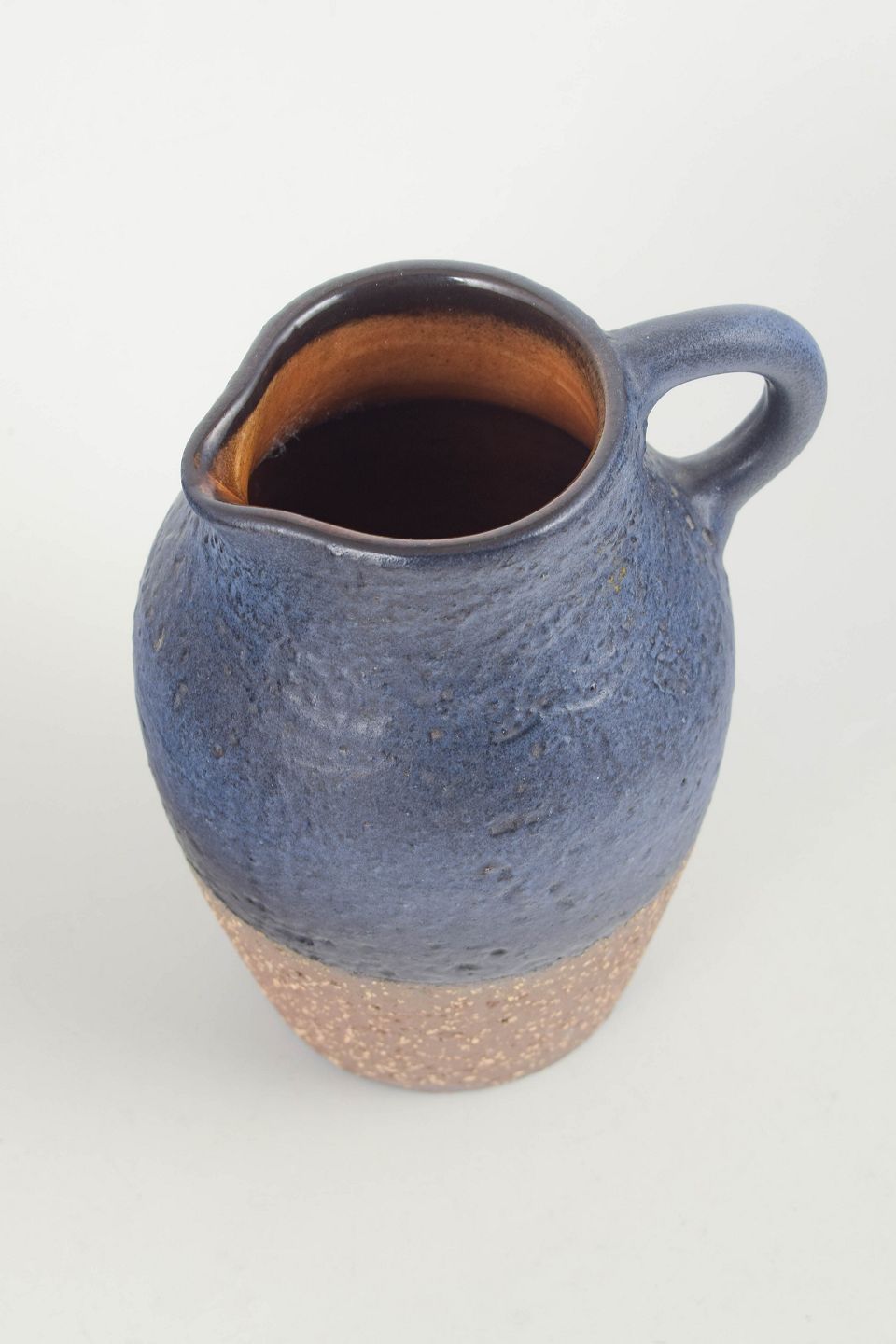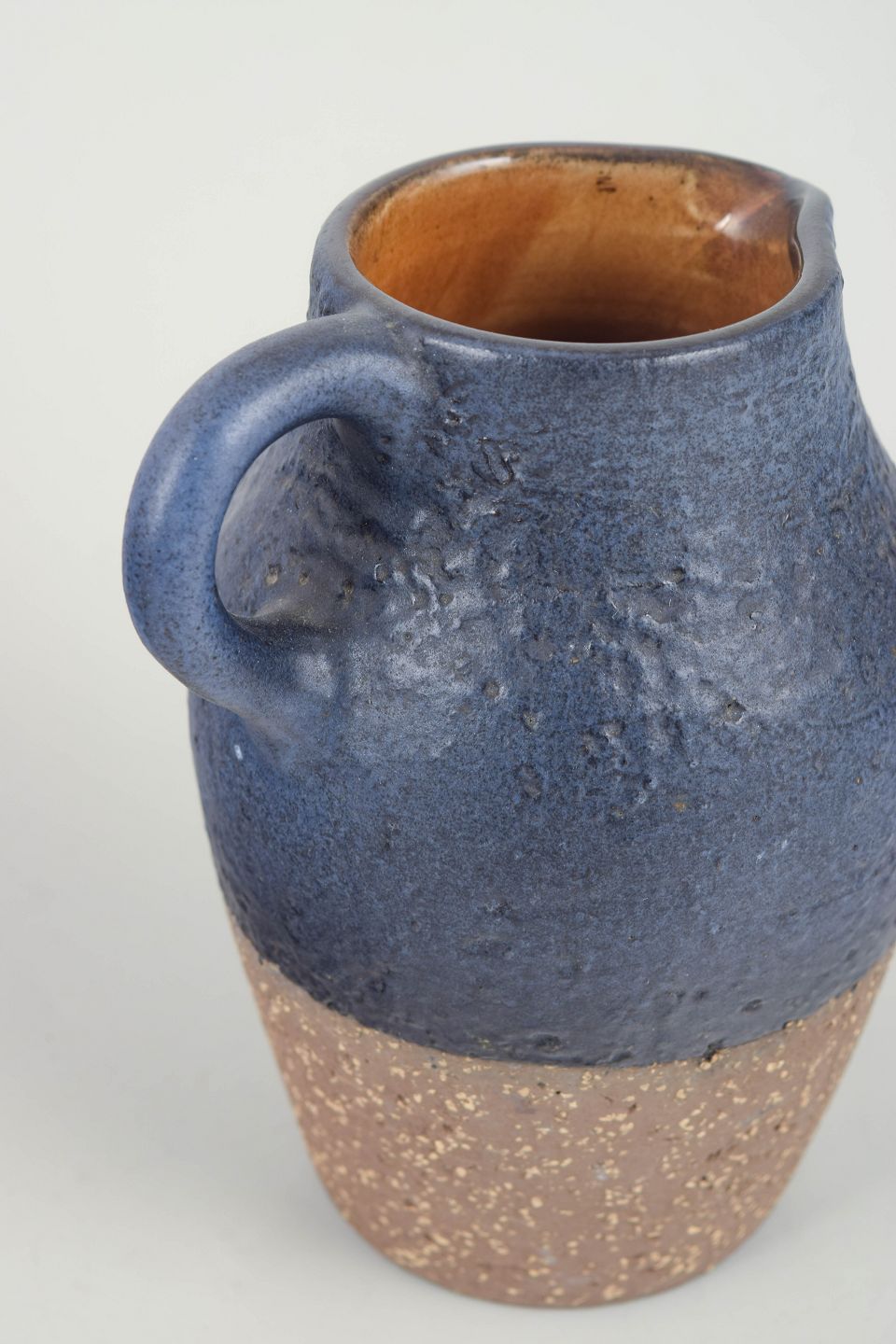 Lille vase i stentøj med dyb blå glasur på overkroppen og rå, uglaseret bund med synlige chamottepartikler. Blødt afrundet korpus med integreret hank og let udadsvungen munding. Stemplet i bunden med UE Sweden samt modelnummer 3048 M.