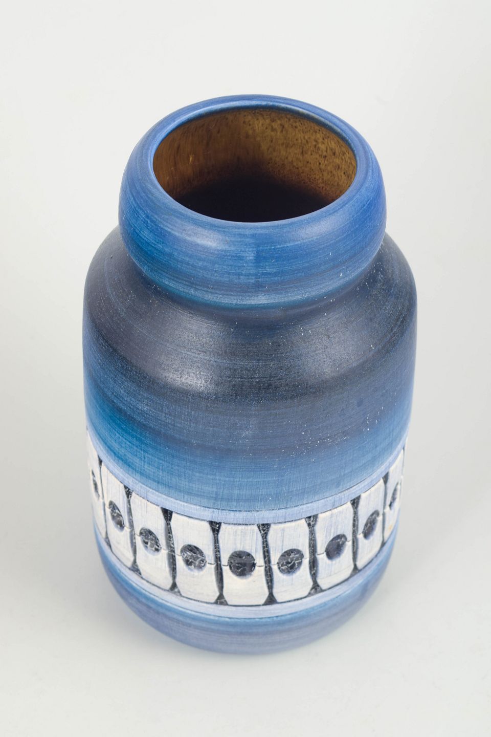 Cylindrisk vase i drejet stentøj med blå glasur i nuancer fra dyb kobolt til lysere blå toner, dekoreret med et grafisk bånd i sort og hvidt. Original mærkat under bunden.