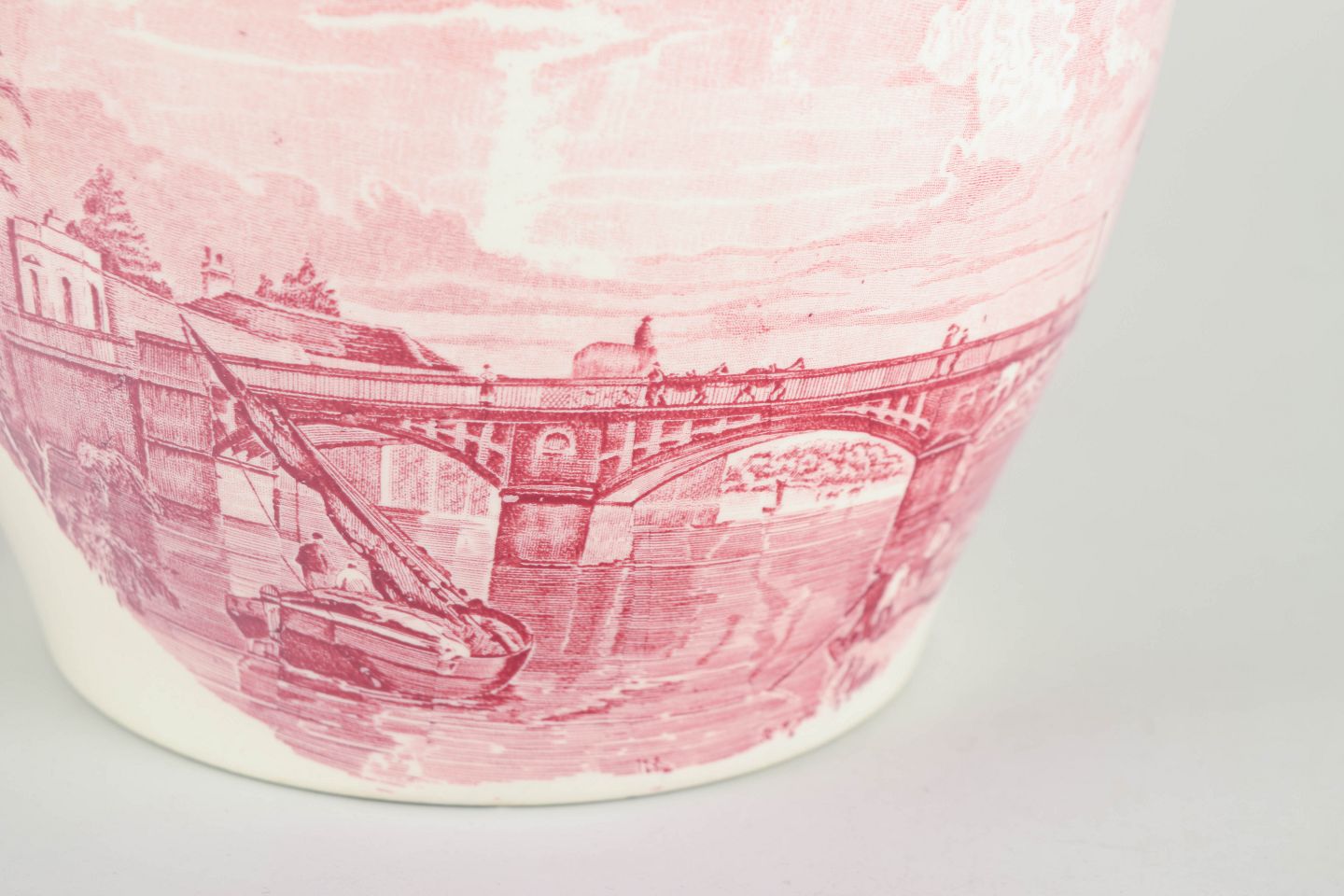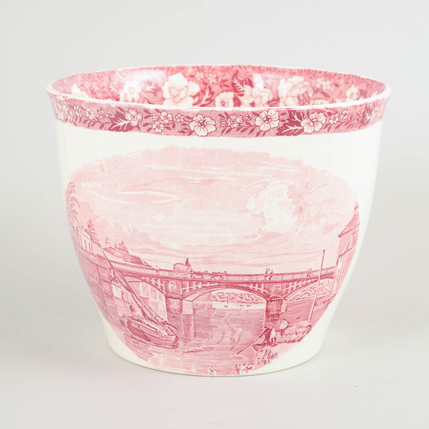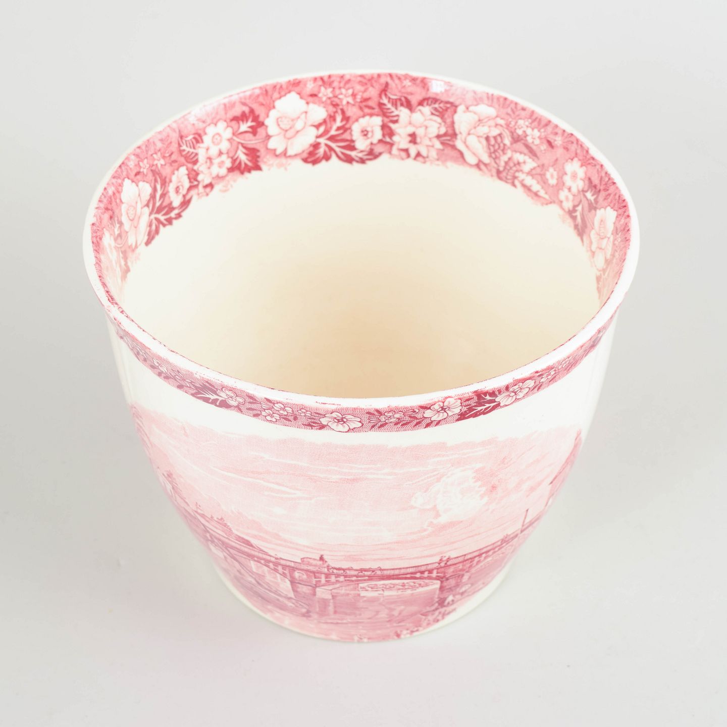 Urtepotteskjuler i fajance fra Palissy Pottery, dekoreret i rød transferware med motiv fra Themsen og ornamental bort.