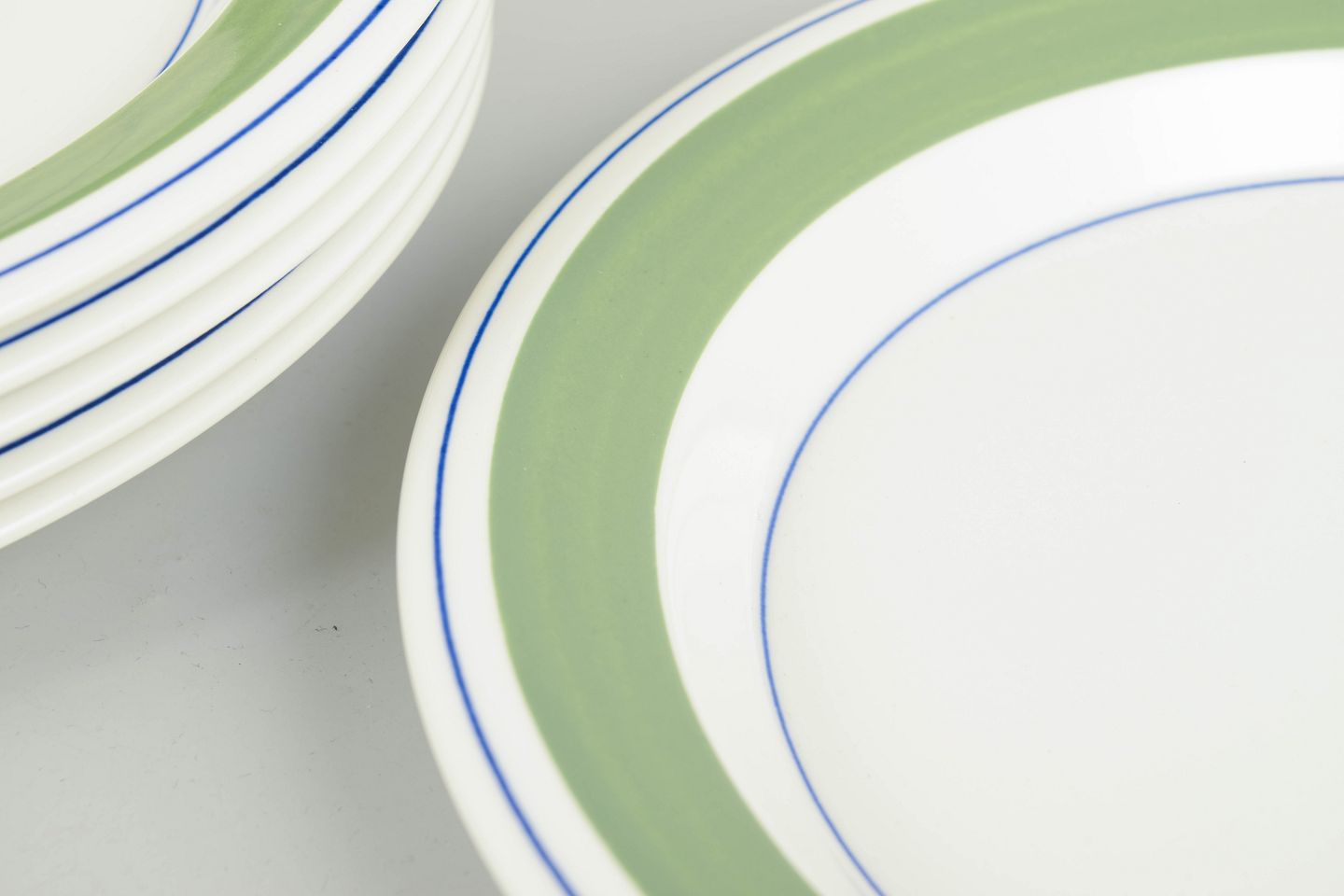 Sæt med 6 middagstallerkener dekoreret med det karakteristiske “Krokus”-mønster i grønne nuancer med fine blå cirkellinjer placeret langs fanen.