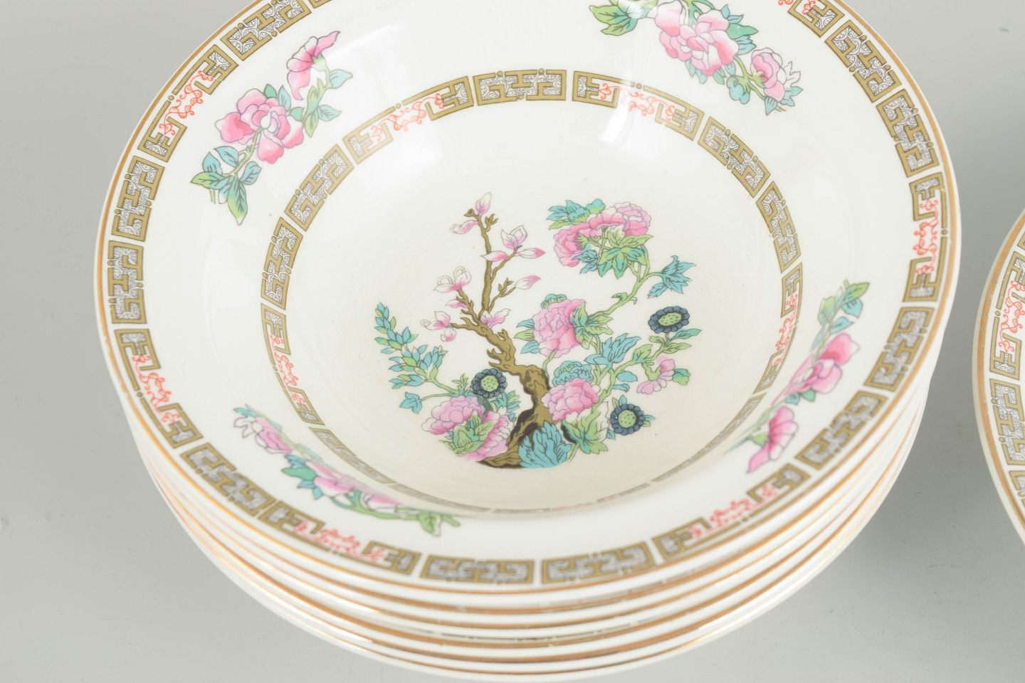 Dekorerede porcelænsskåle med blomsterdekoration og geometrisk bort i guldtoner. Mærket i bunden “Made in England”.