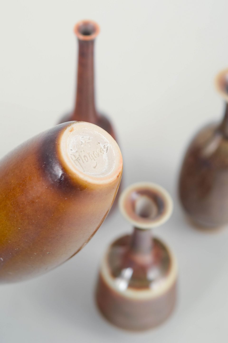 Små drejede stentøjsvaser i slanke og harmoniske former med levende glasurer i varme jordtoner. Typiske for Höganäs’ studioproduktion, hvor proportion, materialitet og glasurens spil er i fokus.