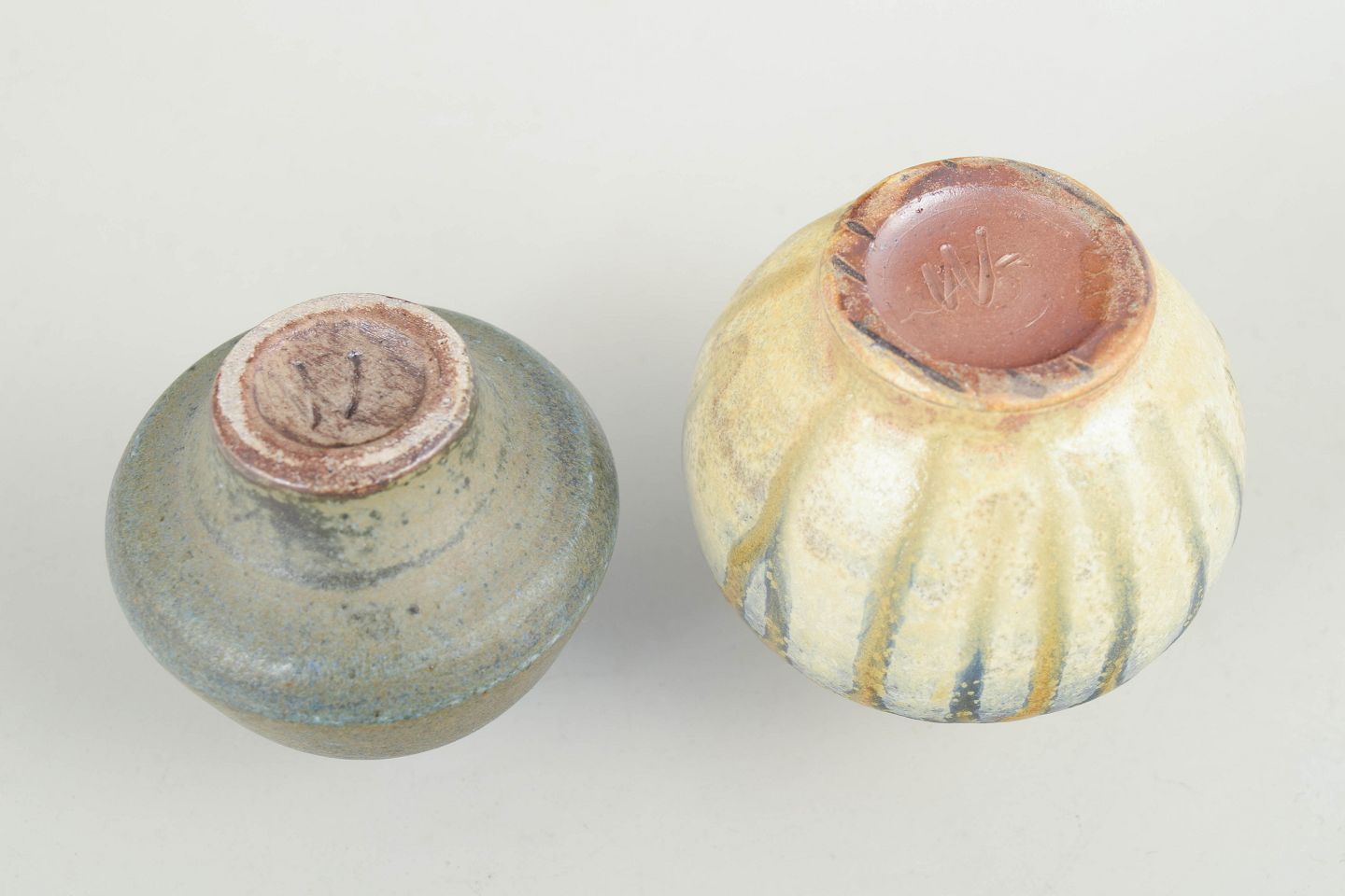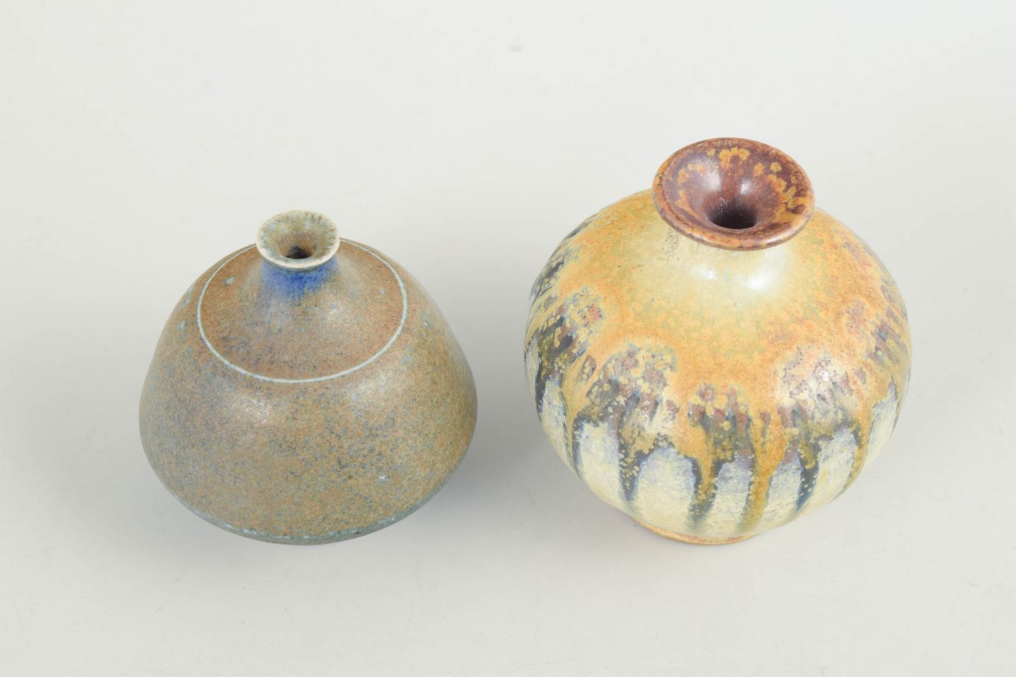 Sæt med to små drejede vaser i stentøj med karakterfulde glasurer i dæmpede jordfarver og løbende effekter, typisk for Wallåkras produktion i perioden.