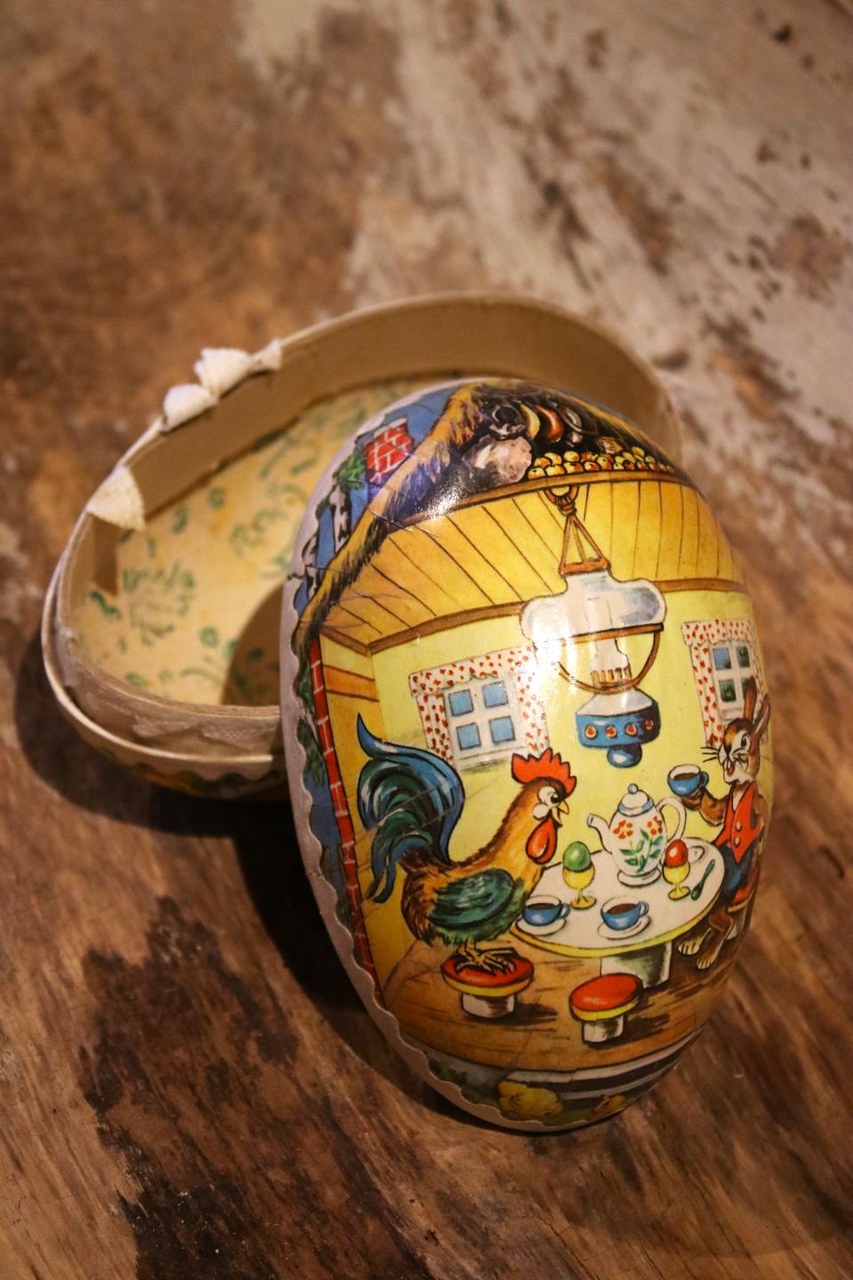 Old vintage Easter egg in papier-mâché with a motif of an Easter bunny and a chicken drinking tea together...