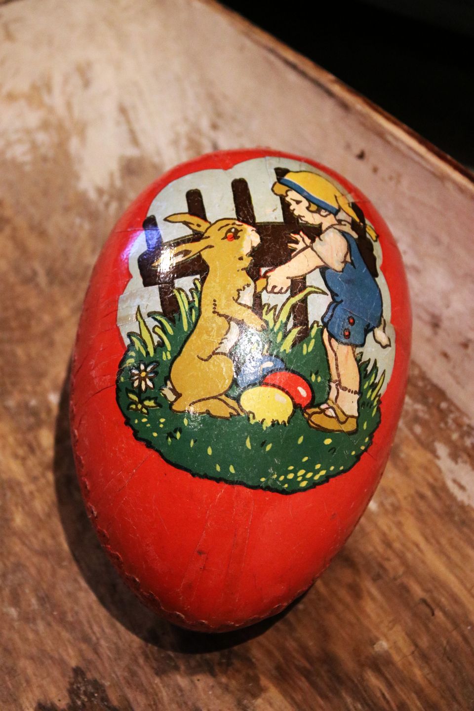Old Easter egg in painted cardboard from the early 1900s with a motif of a little boy and girl with the Easter bunny. Height: 16cm.