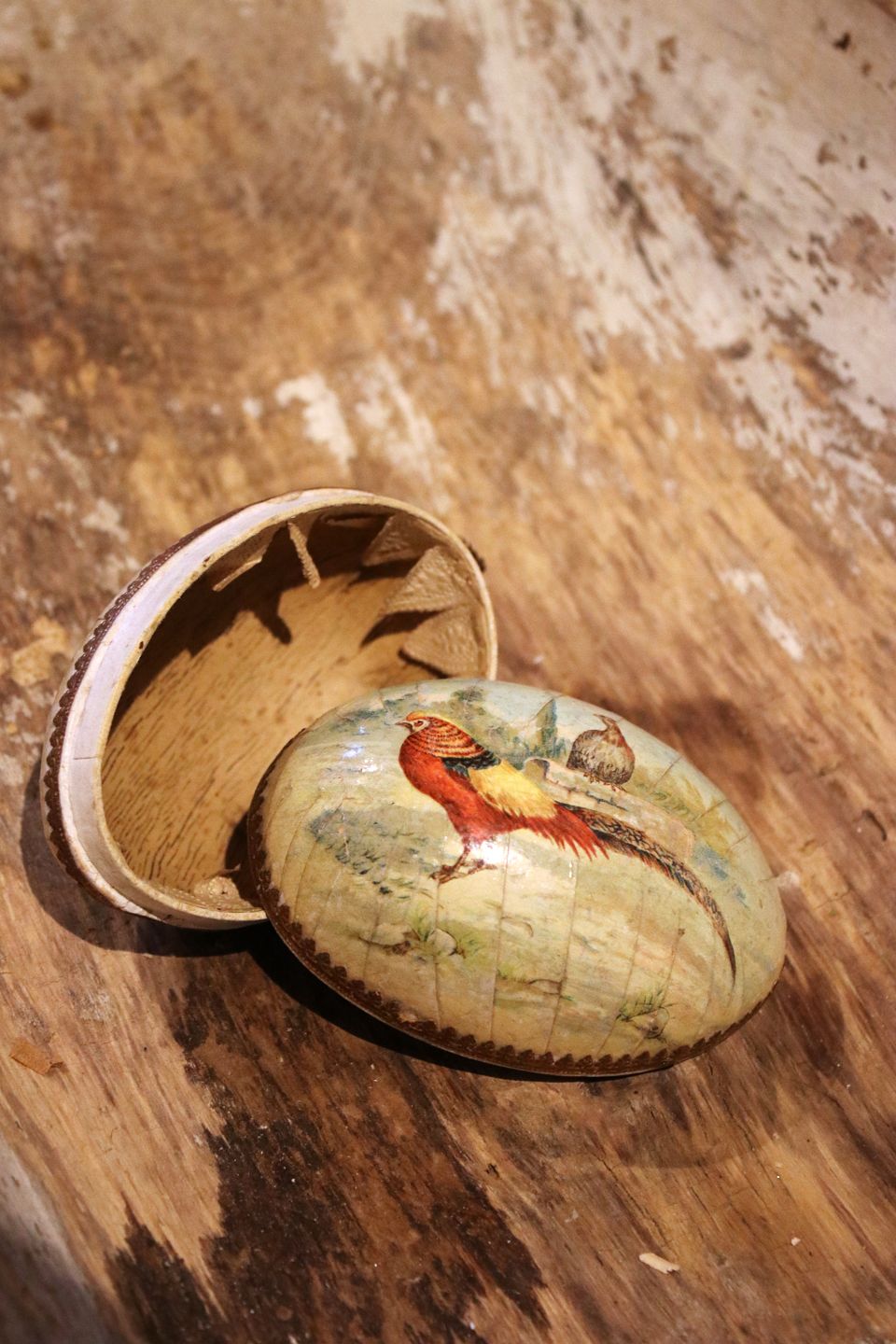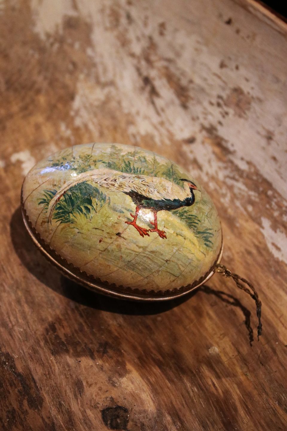 Old wooden Easter egg with painted peacocks from the early 1900s, dated inside 1904...