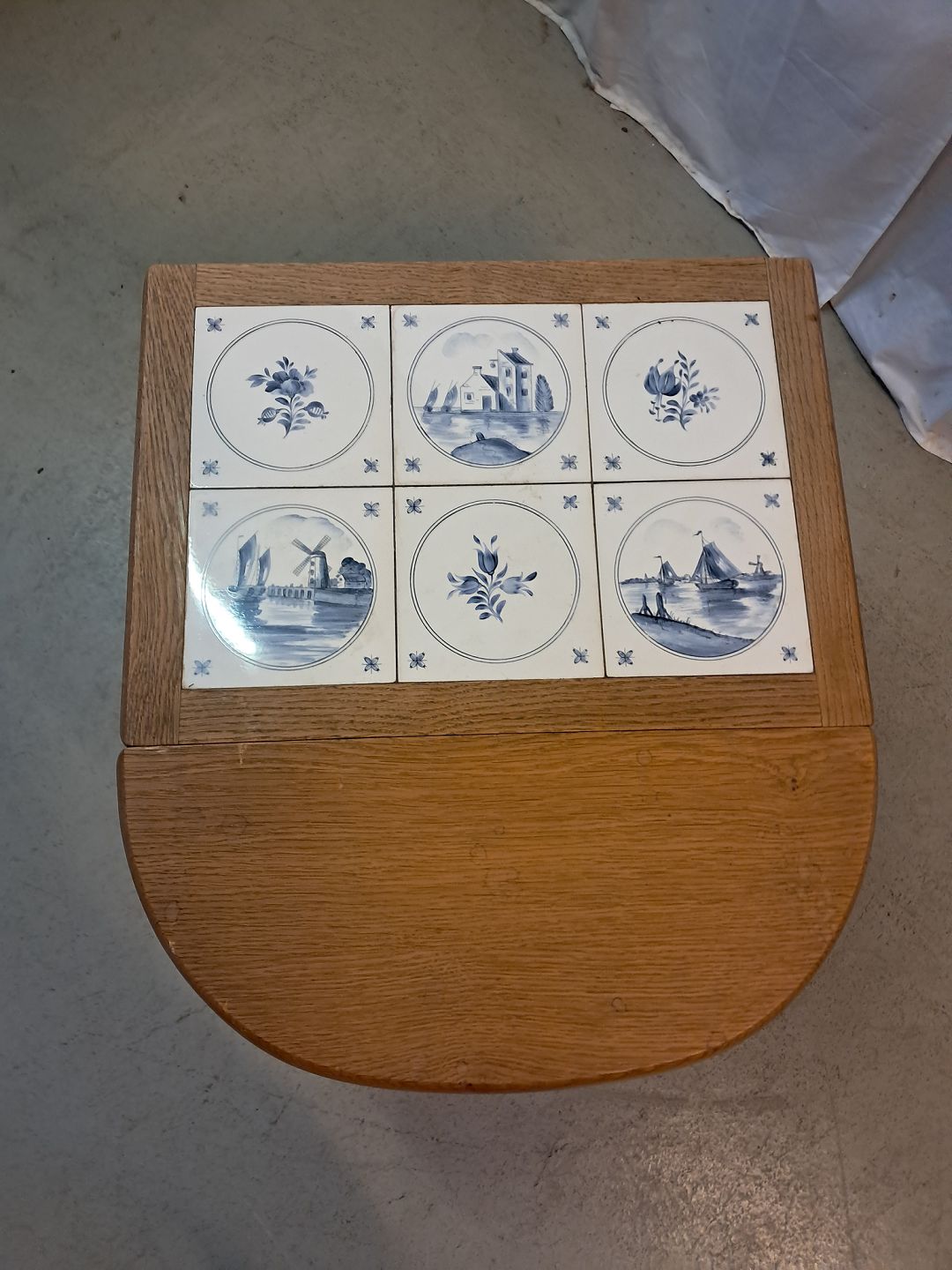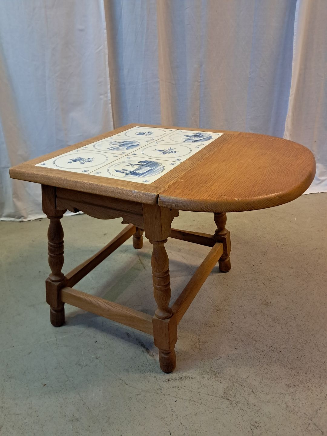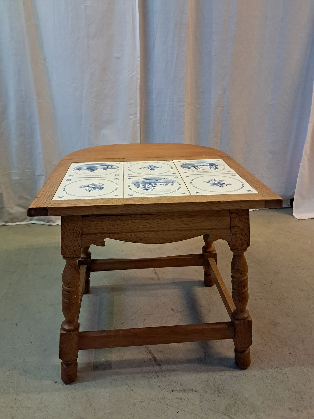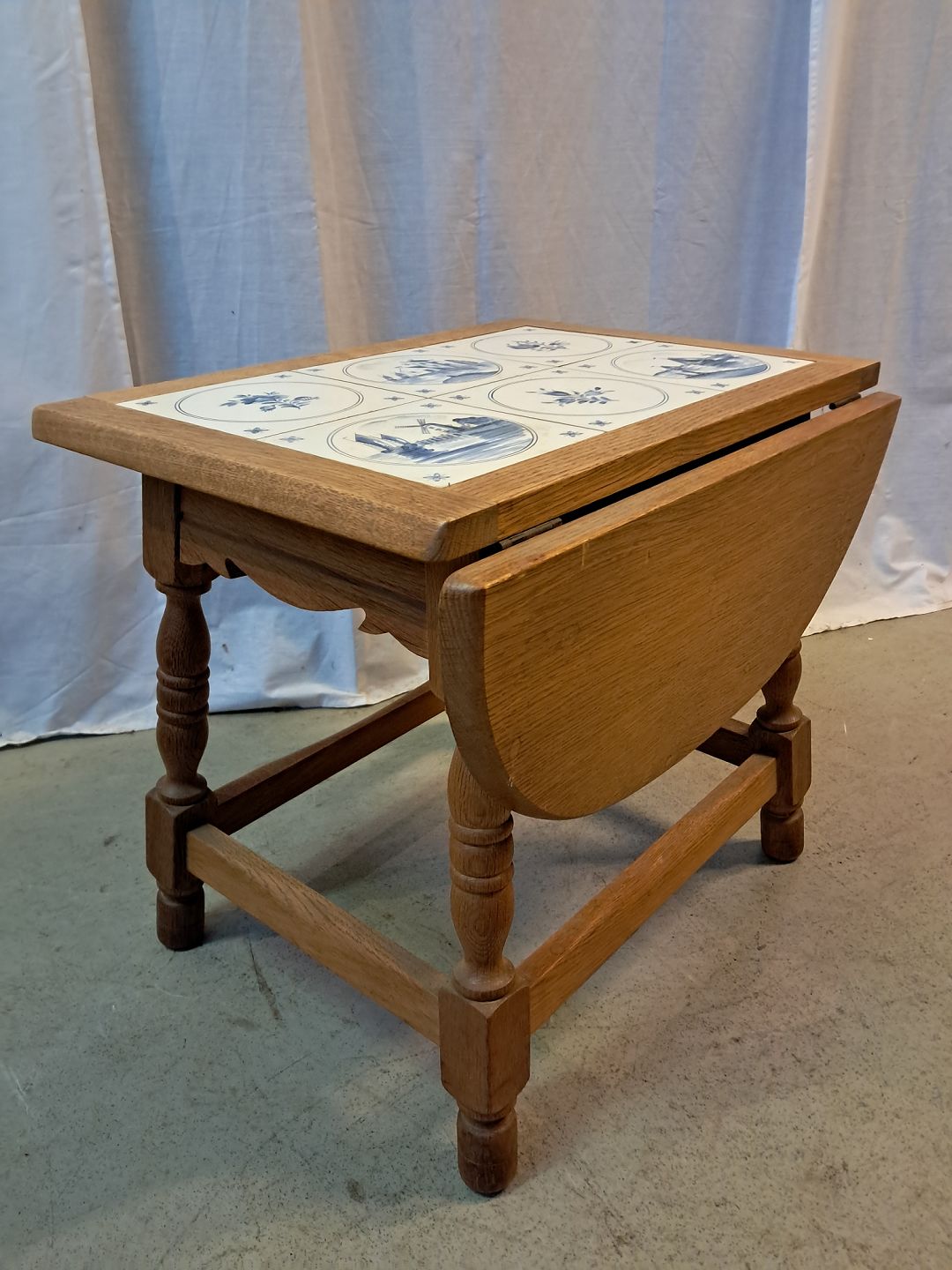 Lille bord i massivt egetræ med kakler og en klap, fra 1980erne.